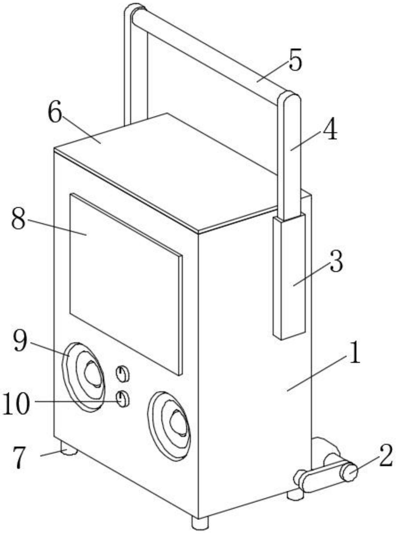 本实用新型公开了集成电动工具电池管理的便携式音响,包括音响本体,所述音响本体下端四角均固定连接有支柱,所述音响本体右端活动连接有移动装置,所述音响本体左端上部和右端上部固定连接有空心杆,两个所述空心杆上端均穿插活动连接有伸缩杆,两个所述伸缩杆相互靠近的一端共同固定连接有把手,所述音响本体上端活动连接有收纳装置,所述音响本体前端上部固定连接有显示屏,所述音响本体前端下部固定连接有两个扬声器,所述音响本体前端下部固定连接有两个旋钮。本实用新型所述的集成电动工具电池管理的便携式音响,通过设置移动装置和收纳装置,可以便于对音响电池进行管理和维修,结构简单牢固,灵活性强,安全性能高。