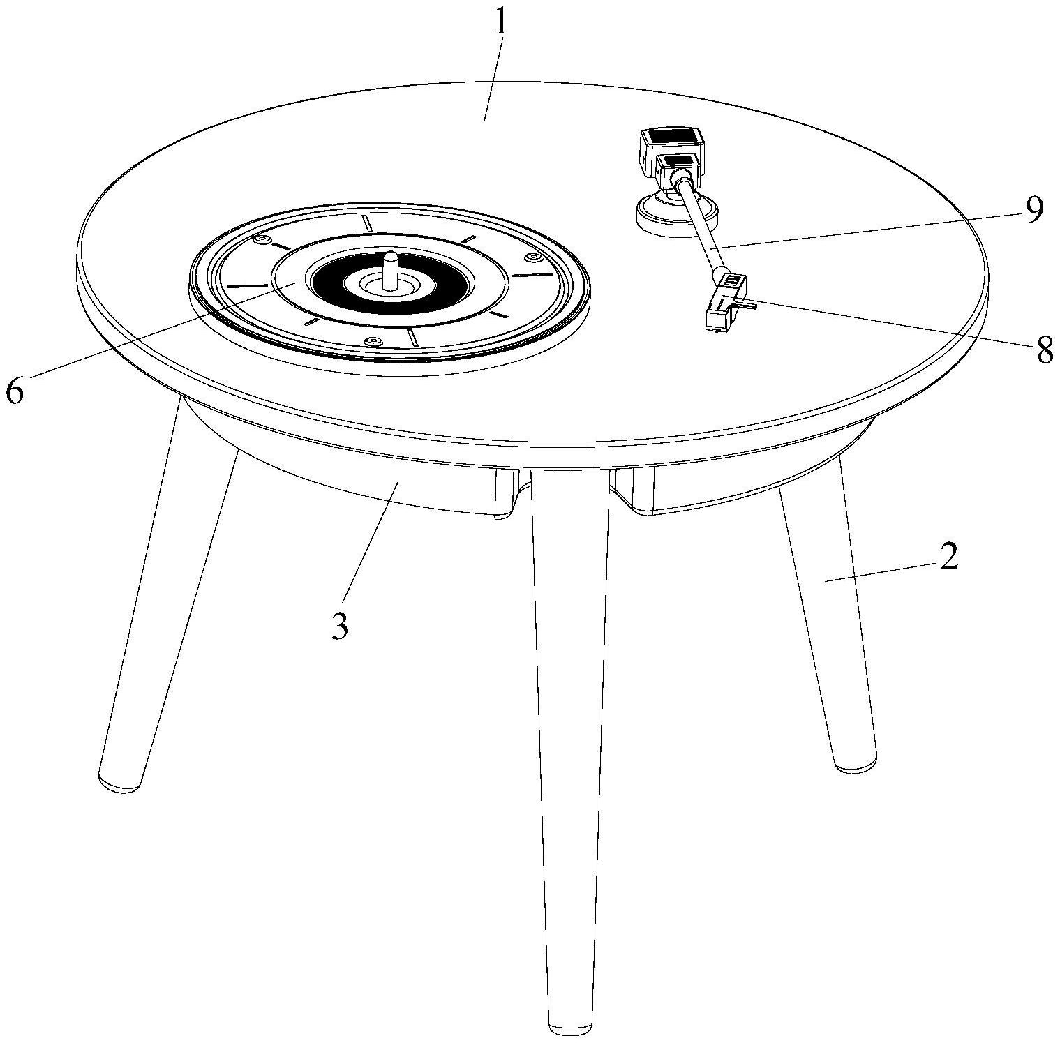 本实用新型涉及家居技术领域,尤其是指一种多功能桌子,包括桌子主体,所述桌子主体包括桌面以及若干桌脚,还包括电唱机以及音箱,所述音箱装设于所述桌子主体并用于与所述电唱机信号连接,所述桌子主体还开设有安装腔,所述安装腔位于所述桌面的下方,所述电唱机包括唱盘组件、唱头组件、用于驱动唱盘组件转动的驱动组件以及用于使唱头组件活动的转动组件,所述驱动组件和转动组件均装设于所述安装腔中,所述唱盘组件和所述唱头组件均转动装设于所述桌面。本实用新型提供的一种多功能桌子,集合了桌子、电唱机以及音箱的结构,实现一桌多用的目的。
