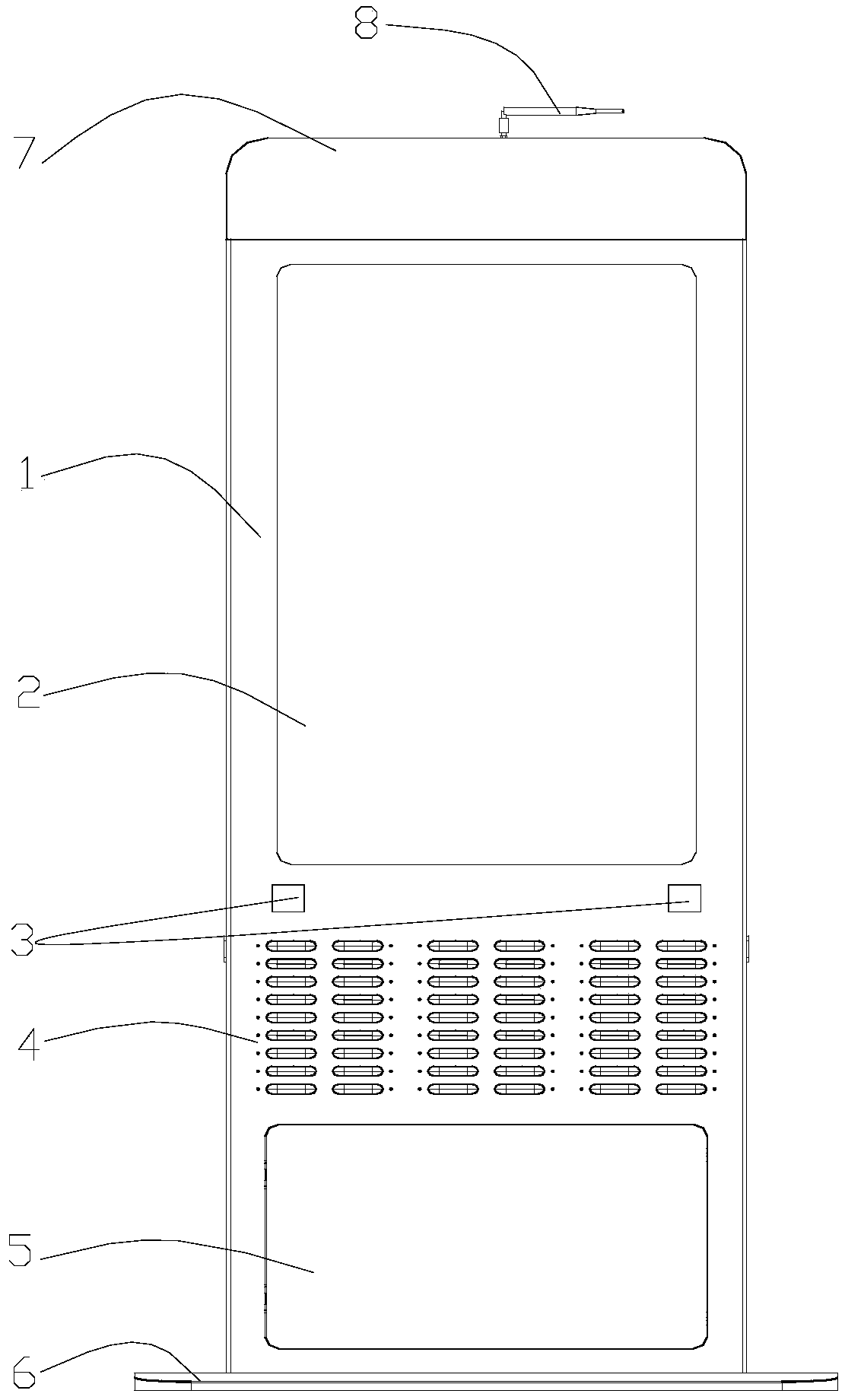 本实用新型涉及共享充电宝设备的技术领域,提供了一种共享充电宝广告机,包括:机柜本体,其特征在于:所述机柜本体内部设置有层板,所述层板将内腔分为沿垂直于底座顶面的方向自上而下顺序布置的上腔体、中腔体、和下腔体;所述上腔体外部设置有显示屏组件,所述上腔体内部设置有主控模块,所述中腔体对应外部设置有充电宝仓位,所述充电宝仓位口设置有挡板,所述中腔体内部位置设有机芯组件,所述下腔体外部设置有海报展示框组件,所述下腔体内部设置有电源组件;所述机柜外壳上方设置有灯箱组件,所述灯箱组件上方设置有天线,所述机柜本体外壳表面设置有扇热窗口,所述机柜本体中腔体还设有风扇。与现有技术对比,本实用新型共享充电宝广告机,能够在共享充电宝的同时,扩展广告播放及共享海报功能,吸引特定人群的注意,以解决现有技术中存在的机柜功能单一、宣传效果不佳的技术问题。