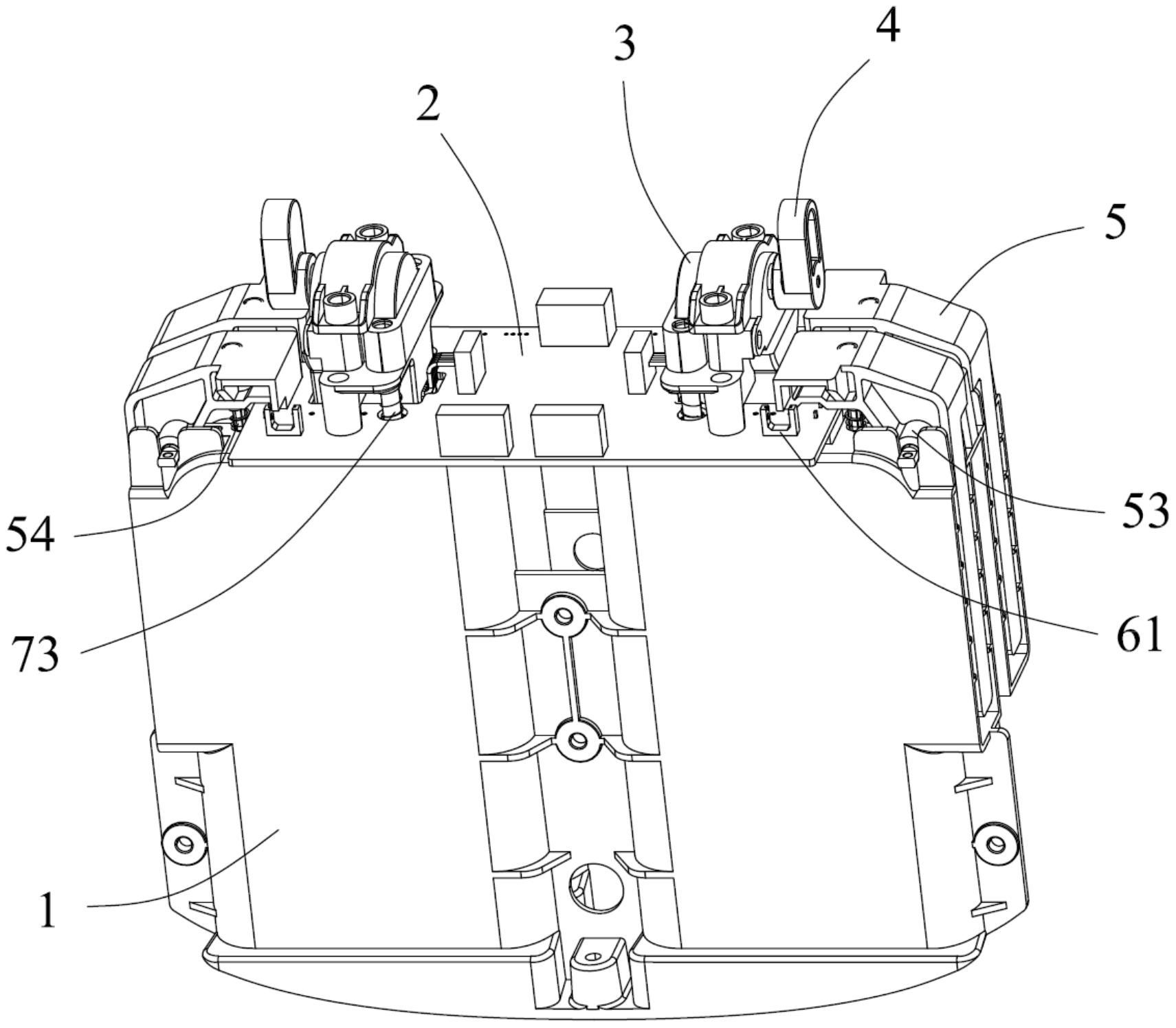 本实用新型涉及电源技术领域,特别涉及一种共享移动电源的电池仓机构及其租借设备。其共享移动电源的电池仓机构包括机芯模组、锁扣模组、驱动模组,机芯模组内至少设有两个放置移动电源的电池仓,每一锁扣模组对应一个电池仓,锁扣模组锁止或解锁电池仓内的移动电源,每两个相邻的锁扣模组之间设有一个驱动模组,驱动模组包括电机和摆臂,摆臂连接在电机上,两个相邻的锁扣模组位于摆臂的摆动区域内,电机驱动摆臂按压一个锁扣模组,解锁一个电池仓内的移动电源。通过一个电机和摆臂来分别控制两个锁扣模组的开闭锁,减少了电机的使用数量,使整体共享移动电源的电池仓机构可以做的更加紧凑,整体体积也更小。