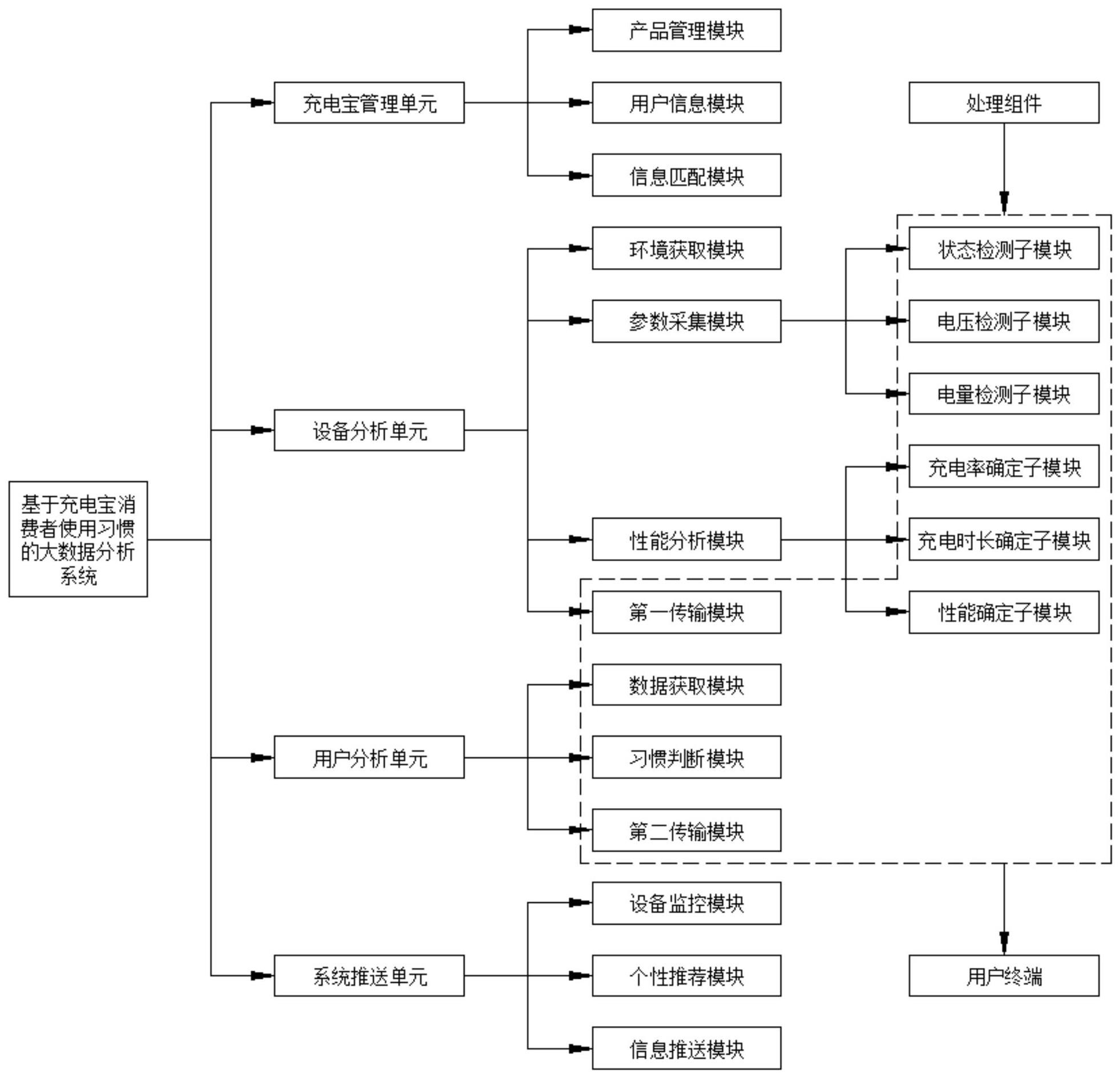 本发明公开了一种基于充电宝消费者使用习惯的大数据分析系统,属于充电宝技术领域。为解决充电宝性能难以掌控以及商家难以针对性的推荐产品的问题,设备分析单元可以对各项设备性能相关数据进行获取,并对充电宝的整体性能及使用寿命进行判断,更加便于用户和商家对充电宝的状态和性能进行该实施掌控,从而帮助商家对一些不良品充电宝进行识别和回收,可以对提前通知客户对充电宝进行更换,用户分析单元可以对用户使用习惯相关数据进行获取,并对用户的充电宝使用习惯及习惯实用场景进行分析,从而使得可以根据不同的用户习惯或者客户的使用场景,对用户进行不同性能的充电宝产品推荐,提高用户体验以及充电宝产品的销售。
