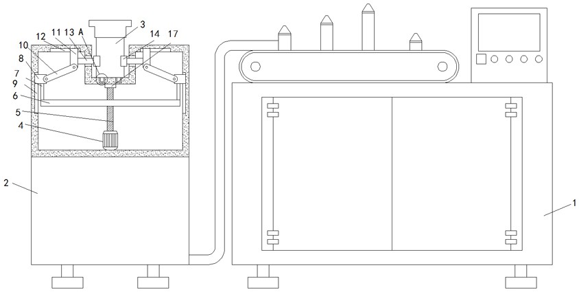 本实用新型涉及一种USB线材自动焊接设备,包括焊接装置,所述焊接装置左侧设置有箱体,所述箱体顶部设置有振动盘,所述箱体内部固定连接有固定结构,所述固定结构包括有固定连接于箱体内部的电机,所述电机顶部固定连接有螺纹杆,所述螺纹杆外表面螺纹连接有螺纹板。该USB线材自动焊接设备,使用时,使振动盘底部限位杆对准插孔,然后启动电机带动螺纹杆旋转,螺纹杆旋转带动螺纹板向上移动,螺纹板向上移动带动连接杆和滑块向上移动,滑块向上移动带动活动杆转动,活动杆转动带动活动块向靠近振动盘的一侧移动,活动块移动带动固定杆和夹块向靠近振动盘的一侧移动,即可将振动盘进行夹紧固定,可以尽量防止振动盘发生偏移。