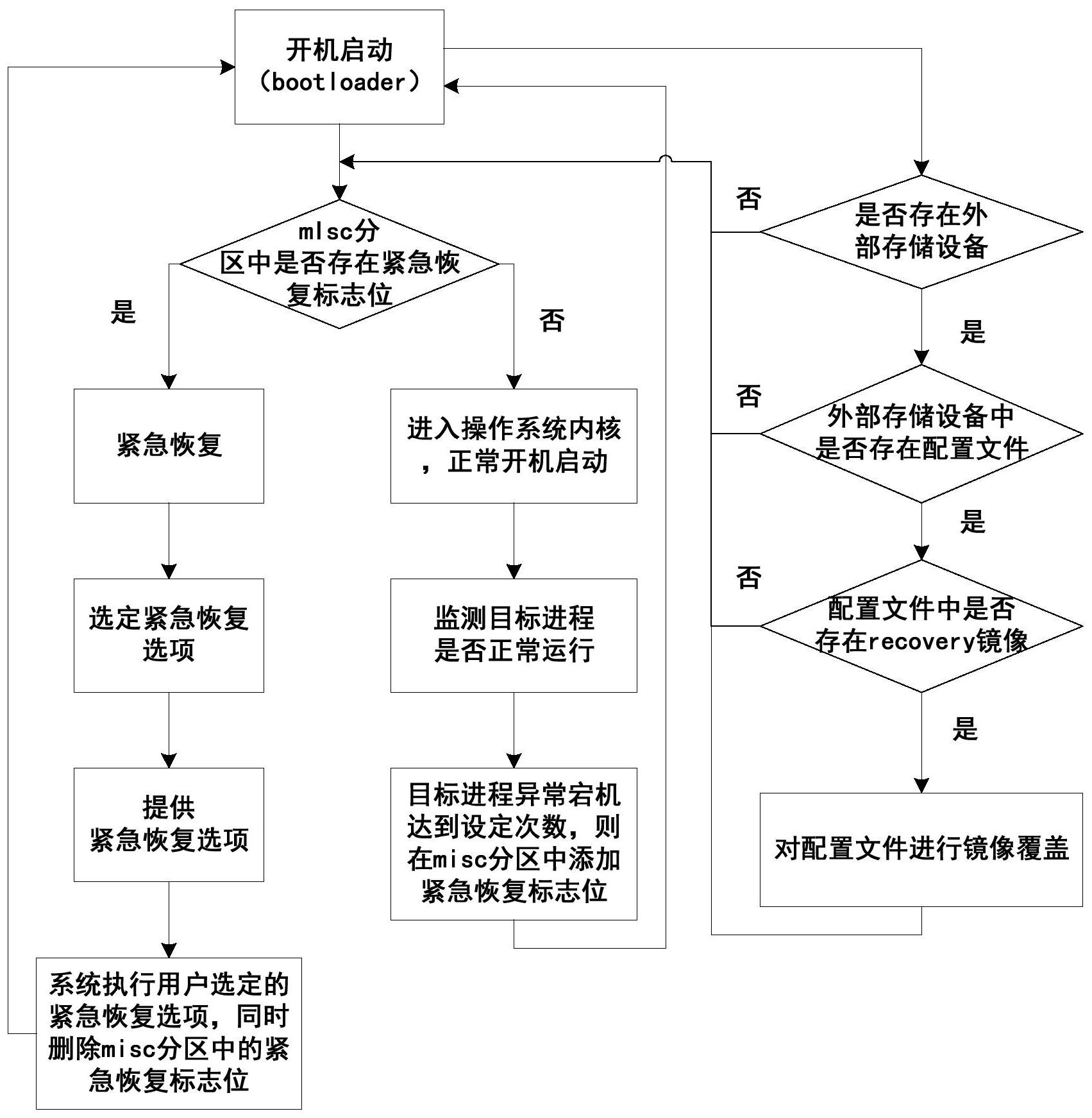 本发明提供一种机顶盒紧急备份恢复升级方法及一种机顶盒紧急备份恢复升级系统,属于数字电视设备领域。所述方法包括:进入机顶盒开机启动流程,检测misc分区中是否存在紧急恢复标志位;若不存在,继续执行开机启动流程;若存在,进入紧急恢复流程,紧急恢复流程为:提供紧急恢复选项;执行用户选定的紧急恢复选项,同时删除misc分区中的紧急恢复标志位;重新进入开机启动流程。该方法通过设置紧急恢复标志位,在需要紧急恢复时进入紧急恢复流程,提供紧急恢复选项,便于用户进行紧急恢复选择,便于用户在实际使用过程中能够通过紧急备份升级来恢复机顶盒,保障机顶盒持续工作,该系统应用于机顶盒,能够在机顶盒异常时实现快速恢复。