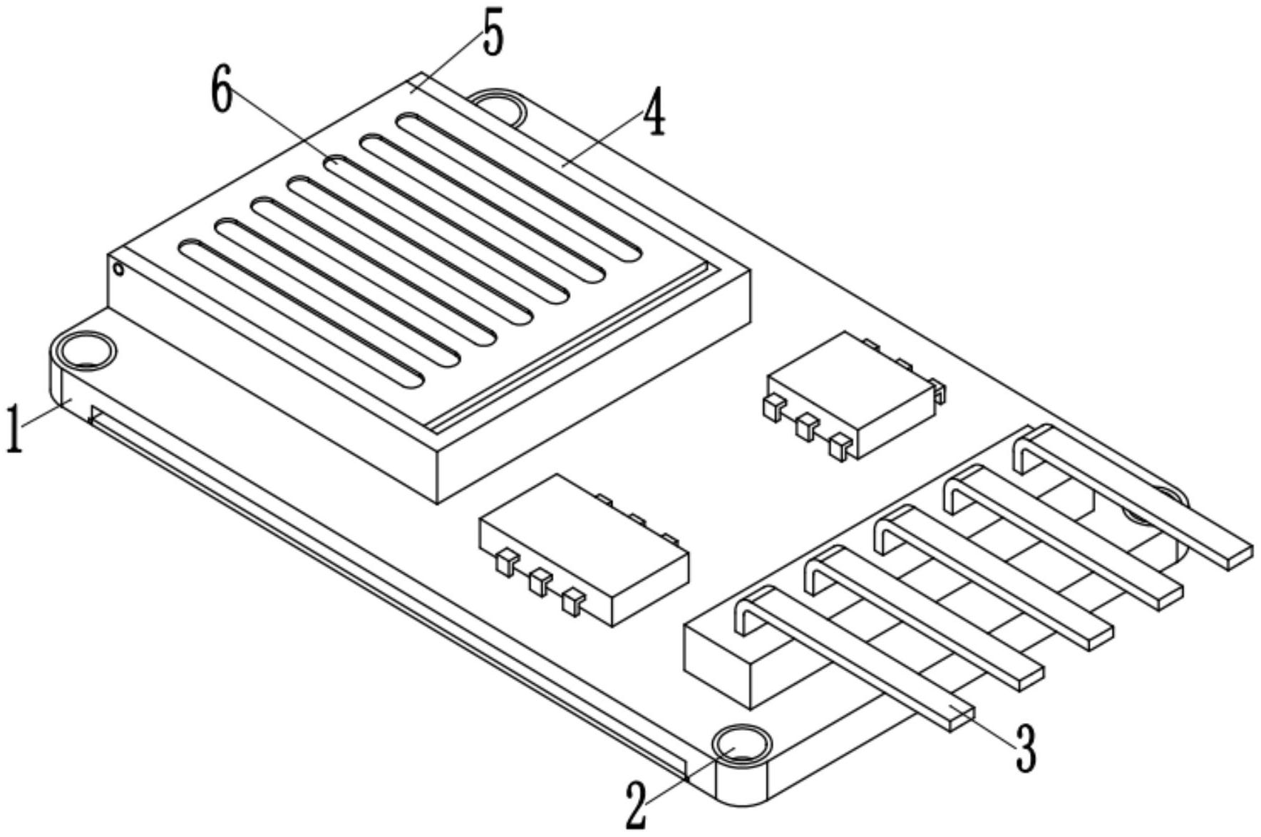 本实用新型公开了一种TF卡模块及TF卡座结构,包括电路板,电路板的底部一体成型有矩形槽,且矩形槽的内部设置有呈等距离结构分布的散热翅片,矩形槽靠近散热翅片相邻的内壁上均开设有定位槽,且定位槽的内部插接有定位块,定位块相邻的一侧设置有石墨烯散热片。本实用新型定位块插接在定位槽的内部,很好的提升了石墨烯散热片在矩形槽内部与散热翅片贴合时的稳定性和牢靠性,使得电路板具有了更好的散热效果,盖板在卡座本体的内部翻转对TF卡进行压持时,定位柱在限位盘和弹簧的作用下插接在定位孔的内部,使得TF卡在卡座本体的内部时可以更加的稳定牢靠,按压定位柱退出定位孔再翻转盖板,从而方便对TF卡进行拆卸。