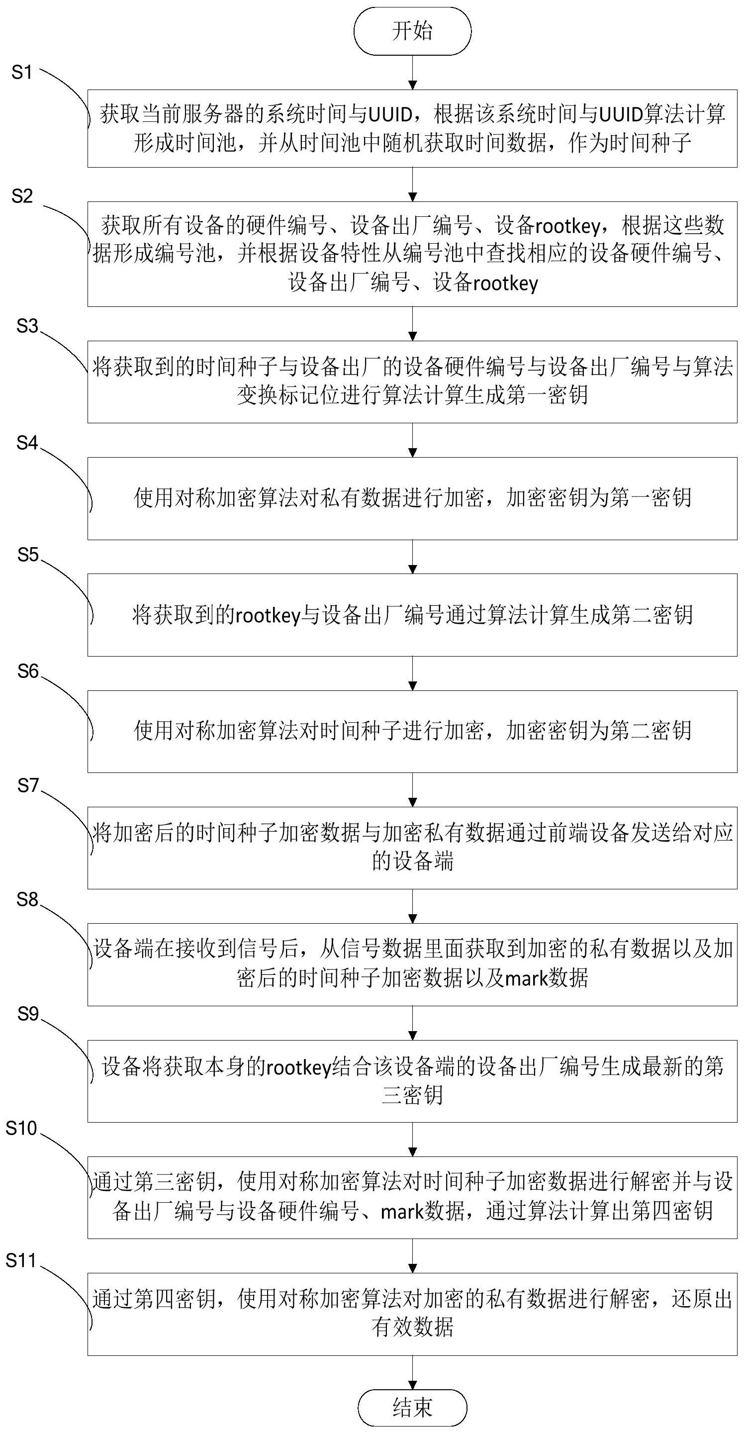 本发明提供一种动态密钥的生成方法及其系统,该方法包括从时间池中随机获取时间种子并生成第一密钥,使用对称加密算法对私有数据进行加密,加密密钥为第一密钥,将获取到的rootkey与设备出厂编号通过算法计算生成第二密钥;使用对称加密算法对时间种子进行加密,加密密钥为第二密钥;设备将获取本身的rootkey结合该设备端的设备出厂编号生成最新的第三密钥;通过第三密钥计算出第四密钥;通过第四密钥,使用对称加密算法对加密的私有数据进行解密,还原出有效数据。本发明的系统应用于上述的方法。本发明基于2层加密安全机制与不重复密钥可以生成相对安全、高效的密钥,可以有效的提高私有数据的安全性,提高了黑客的攻击成本以及降低运营商的损失。