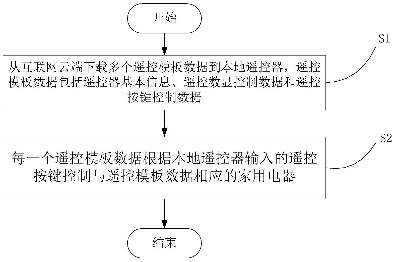 本发明公开了智能家电领域的一种家电遥控方法及系统,方法的步骤包括:1、从互联网云端下载多个遥控模板数据到本地遥控器,遥控模板数据包括遥控器基本信息、遥控数显控制数据和遥控按键控制数据;2、每一个遥控模板数据根据本地遥控器输入的遥控按键控制与遥控模板数据相应的家用电器。本发明设计了一种家电遥控方法,其中,重新定义了一种遥控模板数据结构,根据实际数据的不同,可以实现不同遥控器的功能。并且遥控模板数据存储于云端,存储的数据量不受遥控器的限制,遥控模板数据可以下载更新。