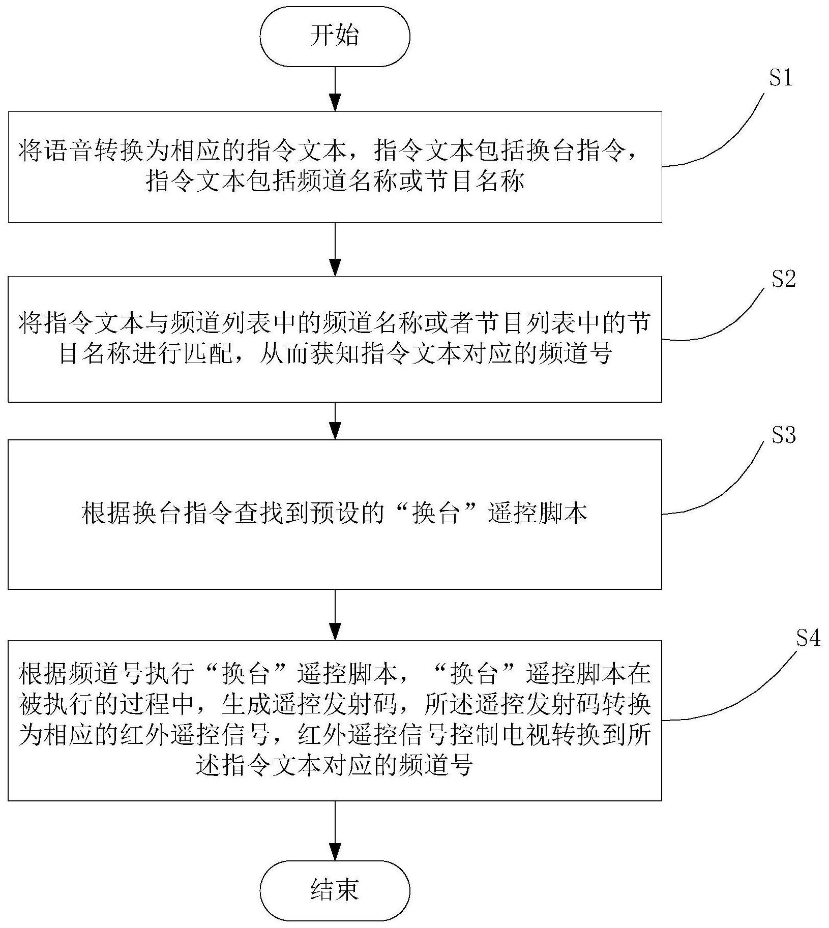 本发明涉及智能家电领域的一种基于语音识别的数字电视遥控换台方法及系统。方法的步骤包括1、将语音转换为相应的指令文本;2、将指令文本与频道列表中的频道名称或者节目列表中的节目名称与进行匹配,从而获知指令文本对应的频道号;3、根据换台指令查找到预设的“换台”遥控脚本;4、根据频道号执行“换台”遥控脚本,生成遥控发射码,遥控发射码转换为相应的红外遥控信号,控制电视转换到指令文本对应的频道号。系统包括:便携终端、遥控发射装置、语音识别服务器和数据服务器。在使用功能脚本数据实现语音控制电视换台时,不用记得电视频道号,只需要根据频道名称或者节目名称,即可完成频道切换,给使用者提供了便利。