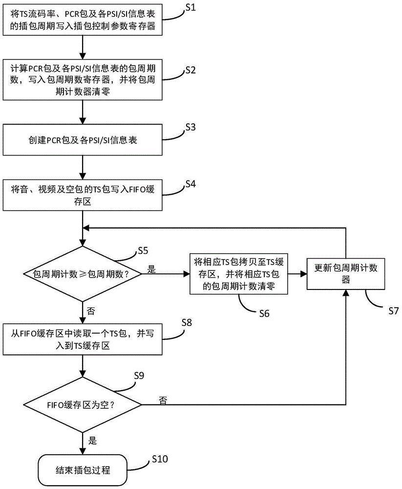 本发明公开了一种传输流复用的插包控制方法,包括以下步骤:将需要进行插包间隔控制的TS包的插包周期按公式换算成表示TS流长度的包周期数,写入第二存储器;比较需要进行插包间隔控制的TS包的包周期计数与其相应包周期数的值,若包周期计数大于等于包周期数,则将相应TS包拷贝至TS缓存区,并将相应TS包的包周期计数进行清零,更新需要进行插包间隔控制的TS包的包周期计数,若包周期计数小于包周期数,则从数据缓存区中读取一个TS包,并写入到TS缓存区;判断数据缓存区是否为空,若为空,则结束插包过程,否,则继续插包过程。通过实施本发明能够实现TS流复用时插包时间间隔的精确控制。