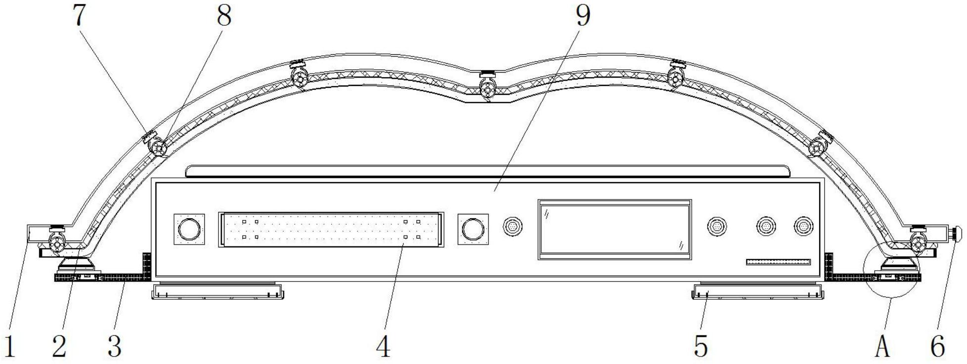本实用新型公开了一种带防护罩的蓝光高清播放器,包括防爆气囊、防护罩、播放器主体和USB接口,所述播放器主体底端的四个拐角处皆固定有吸盘。本实用新型通过安装有预留插条、预留插槽、限位片、锁紧螺栓、绳槽、绳扣、防爆气囊和防护罩,使得装置优化了自身的结构,一方面可以利用预留插条和预留插槽构成的滑动结构,配合限位片和锁紧螺栓的锁紧固定作用,将防护罩在基板上进行安装或拆卸,进而便于使用者将防护罩和播放器主体进行拆卸或组装,从而使得装置实现了组合式的优点,便于拆装维护,另一方面使用者可以利用绳槽和绳扣构成的连接结构,将防爆气囊和防护罩之间进行拆卸或组装,进而便于使用者将损坏的防爆气囊进行更换。