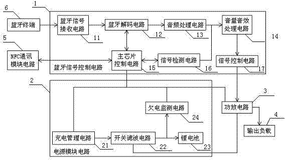 本实用新型提出了一种便携式蓝牙音箱,包括壳体和内置于壳体内的主电路及输出负载,主电路包括蓝牙信号控制电路、电源模块电路和功放电路,电源模块电路包括充电管理电路、开关滤波电路、欠电监测电路和锂电池,充电管理电路的输入端连接外部电源,充电管理电路的输出端与开关滤波电路的输入端电连接,开关滤波电路的输出端与锂电池、欠电监测电路、功放电路电连接,充电管理电路、欠电监测电路、功放电路分别与蓝牙信号控制电路电连接,输出负载与功放电路电连接。本实用新型耗电低,可以实现智能化控制,绿色环保,能让用户随心所欲的播放各种移动音源;便于随身携带与安放,音质好,具有超长的工作时间与待机时间。