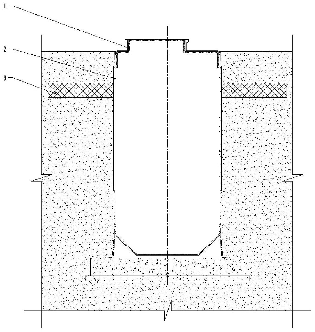 本实用新型涉及防冻隔热技术领域,提供了一种一体化雨水/污水提升泵站防冻装置,所述防冻装置包括上盖单元(1)、筒体单元(2)以及外部隔离层(3);所述筒体单元(2)由外部保温层外壳单元(8)和筒体(9)粘接而成;所述外部隔离层(3)设置在筒体单元(2)的外侧,位于冻土层和非冻土层之间并沿着水平方向向四周延伸;所述上盖单元(1)包括入孔铝合金盖(4)、入孔防护栅栏(5)以及泵站玻璃钢上盖(6);所述入孔铝合金盖(4)内侧设置有保温材料(7),所述入孔防护栅栏(5)从内部支撑所述入孔铝合金盖(4);所述泵站玻璃钢上盖(6)内侧设置有保温材料并且该保温材料延伸至所述筒体(9)内侧。