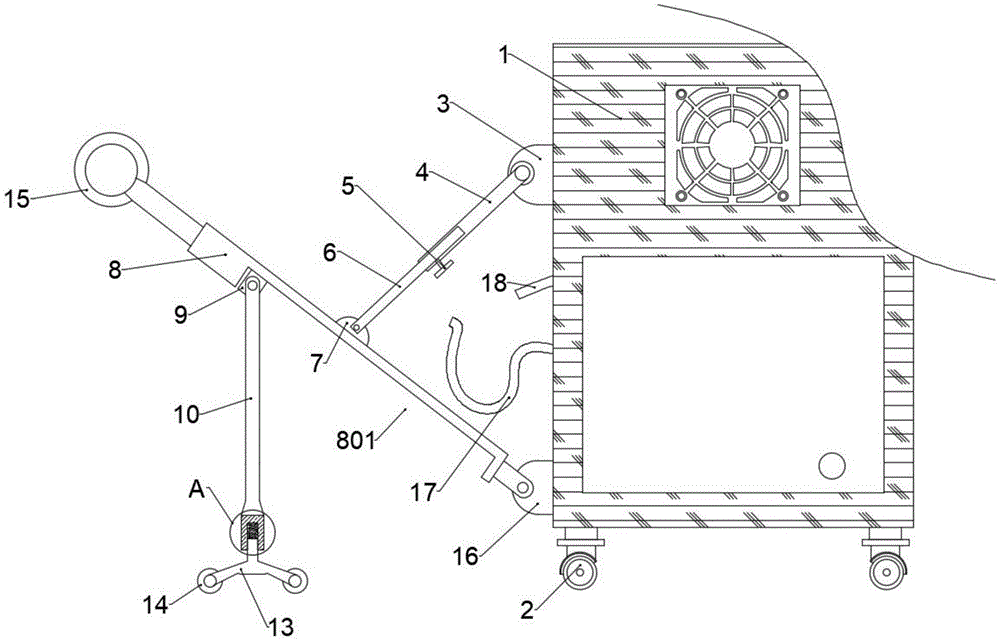 本实用新型公开了一种酒店专用空气净化装置,包括空气净化箱,空气净化箱的底部四角位置上各设置有一个万向滚轮,伸缩支撑杆与伸缩套筒的相对位置通过紧固螺栓进行确定,伸缩支撑杆的顶端端部通过三号铰接座可转动铰接在主推柱的中部位置处柱壁面上,辅助支撑柱的底端端面上一体固定有减震套筒,减震套筒的筒腔中设置有减震缓冲弹簧,在三脚安装座的底端三个支脚上分别对应安装有一个辅助移动轮,在空气净化箱的左箱壁中部位置处设置有捆绑公带和捆绑母带。本实用新型一方面能避免整个空气净化装置发生倾倒提高其稳定性,另一方面能减轻管理人员的推力以更轻松的状态进行工作,管理人员还可将部件结构进行折叠,实用性更高。