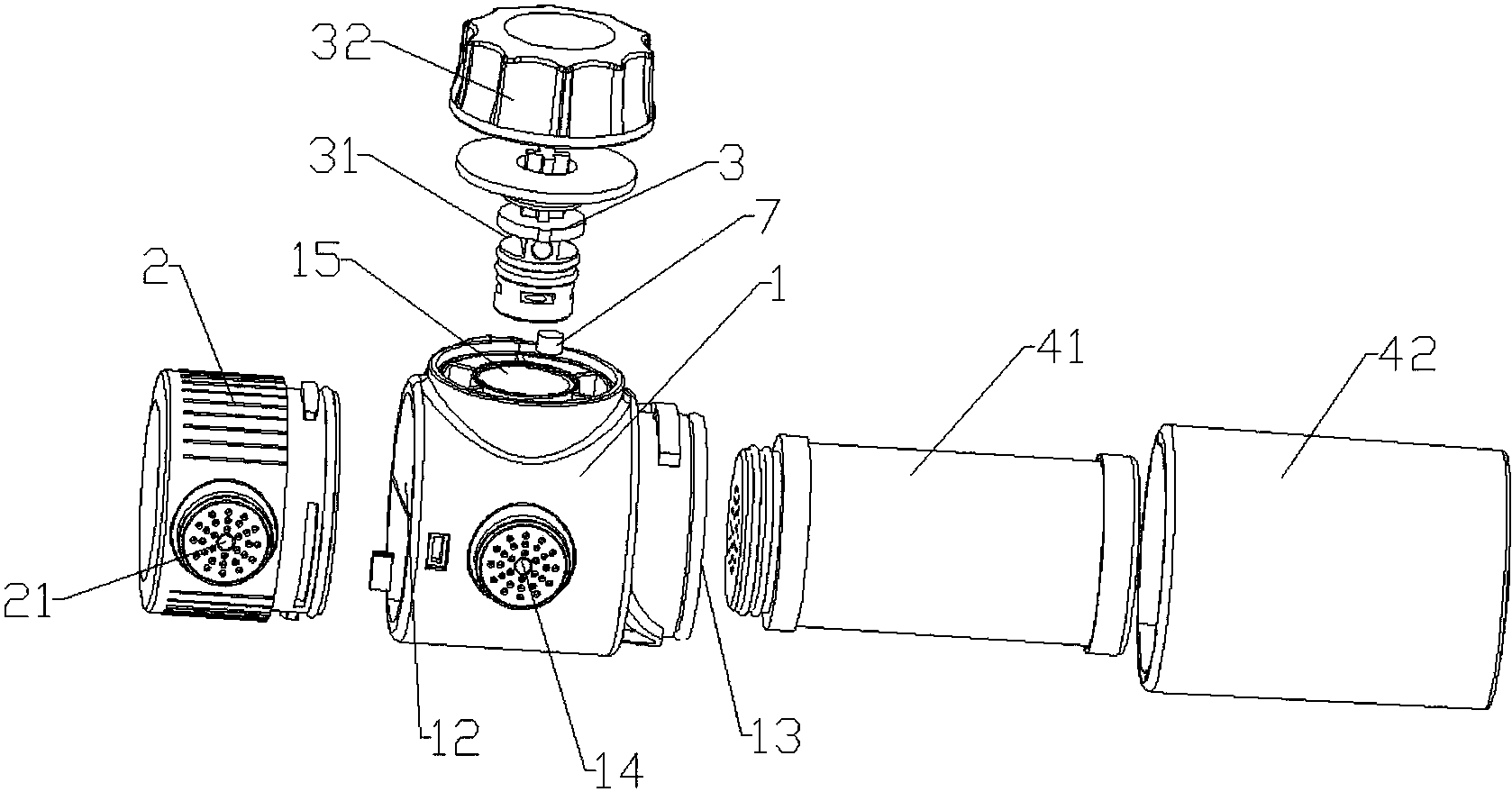本发明公开了一种一体式水龙头净水器,包括主体、端盖、转换器、以及过滤组件,主体整体呈立体五通结构,且第一开口端与外界水龙头相连作为原水进口;第二开口端连接端盖,与第一开口端间具有相连通的原水水路,端盖一侧具有孔道作为原水出口;第三开口端连接过滤组件,用以通入原水进行过滤为净水;第四开口端与过滤组件相连通以将净水送出主体外;第五开口端向内穿设有转换器,净水、原水水路在主体内部空腔中交汇形成有交换室;转换器下端位于交换室内,可在主体内活动,用以切换主体内流通的原水水路或净水水路。其技术方案采用一体式的主体设计,有效减少了产品零部件数量,提高产品的可靠性,降低产品设计的模具费用和制造费用。