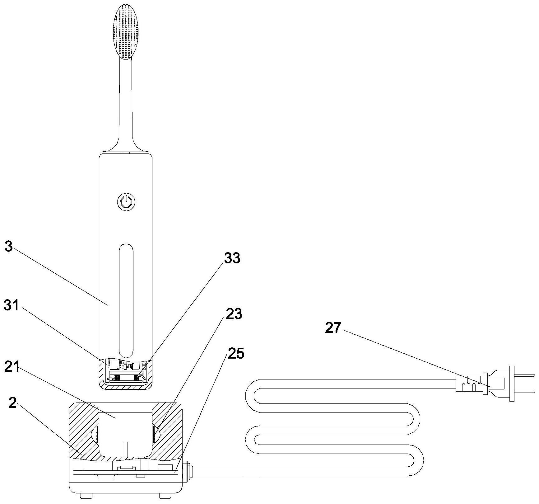 本发明公开了一种无线充电式电动牙刷,其包括与市电相连的充电座、与充电座无线感应充电的电动牙刷机身,其中充电座包括无线发送线圈、和与无线发送线圈电性相连的充电座控制板,而电动牙刷机身包括机身控制板、与机身控制板电性相连且与无线发送线圈相互感应的无线接收线圈、以及充电电池。本发明采用低成本无线充电技术、电子式识别金属异物、检测对方异常状态、检测当前何种工作模式等情况,给予相应的显示提示与安全保护,且无需额外增加电动牙刷机身与其充电座之间专用高频通讯模块或增加信号检测线,仅通过电动牙刷机身与充电座就可以彼此可靠检测对方的状态。