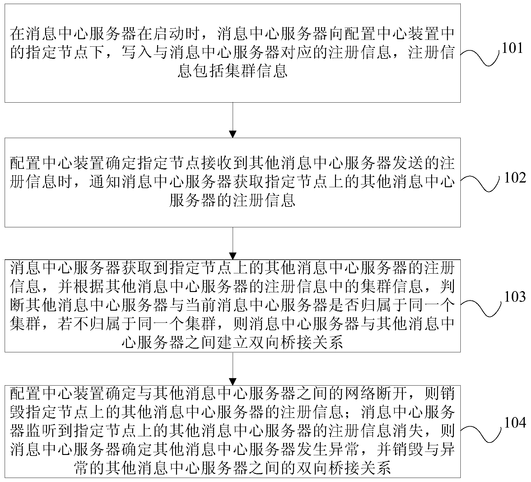 本发明提供一种基于分布式消息的设备处理方法和系统,其中,该方法包括:消息中心服务器向配置中心装置中的指定节点下,写入发送注册信息;配置中心装置确定指定节点接收到其他消息中心服务器发送的注册信息时,通知消息中心服务器获取指定节点上的数据;消息中心服务器根据其他消息中心服务器的注册信息中的集群信息,判断其他消息中心服务器与当前消息中心服务器不归属于同一个集群,则消息中心服务器与其他消息中心服务器之间建立双向桥接关系。消息中心服务器通过配置中心监听其他消息中心服务器上线、离线,完成弹性扩展,实时调整各服务器集群之间的消息中心服务器的双向桥接关系,避免了静态桥接重启服务、组播桥接对网络的影响。