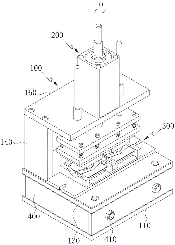 本实用新型公开了一种小型压力机,底座通过支撑柱与承接板连接,承接板通过支撑板与气缸连接板连接。底座、承接板以及气缸连接板相互平行设置。弹簧套接在螺杆上。驱动气缸与气缸连接板连接,驱动气缸与驱动杆驱动连接,驱动杆穿过气缸连接板与第一驱动推板连接,各螺杆的杆体穿过第一驱动推板与第二驱动推板连接,各螺杆与第一驱动推板滑动连接。各弹簧设置在第一驱动推板和第二驱动推板之间,第二驱动推板背向第一驱动推板的一面与挤压板连接。第一承载板与承接板连接,第一承载板背向承接板的一面与第二承载板连接,第二承载板背向第一承载板的一面与第三承载板连接。继电器与驱动气缸电连接,继电器设置有两个开关。两个开关相互串联设置。