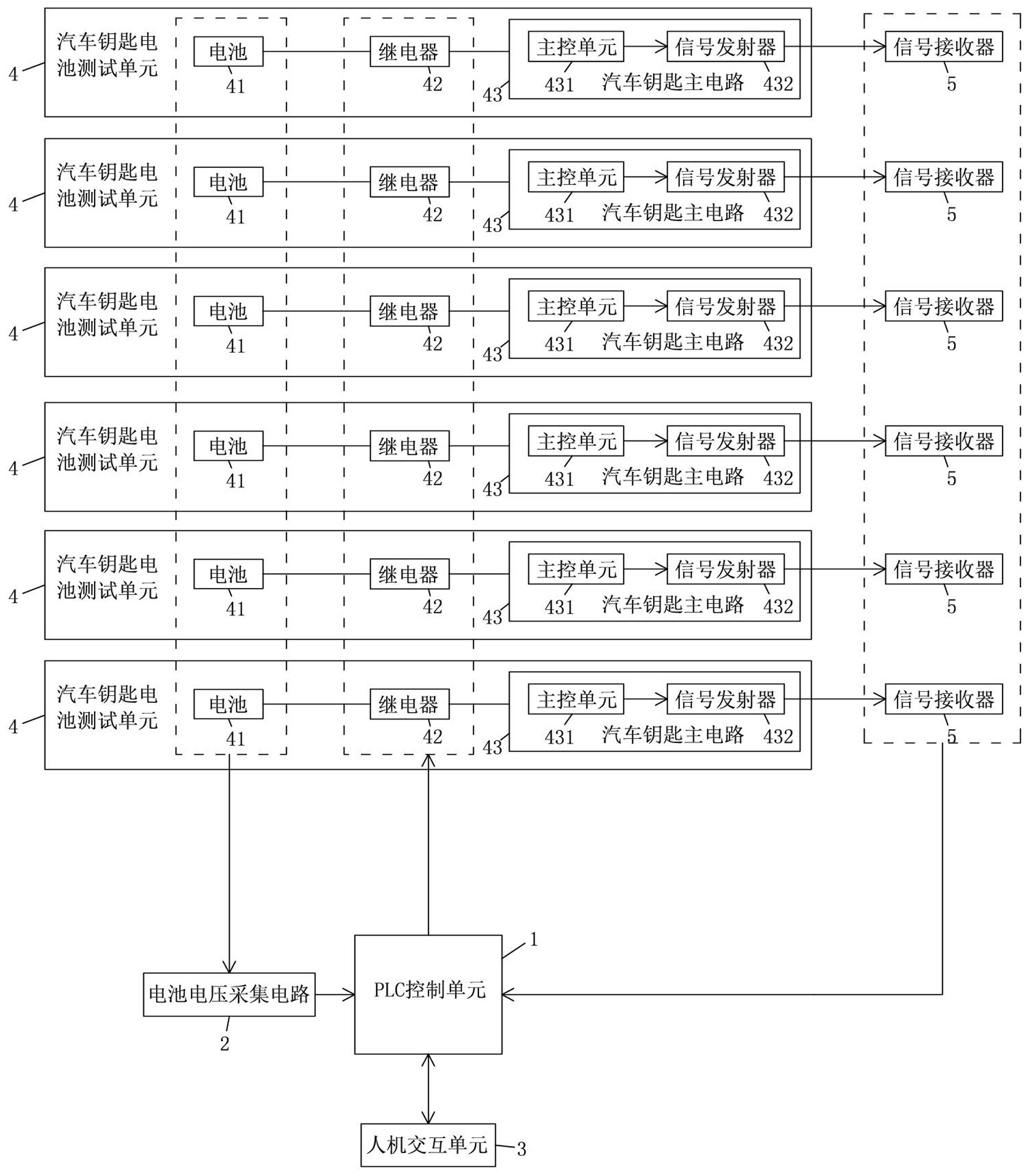 本实用新型公开了一种汽车钥匙电池使用寿命自动测试装置,包括PLC控制单元、电池电压采集电路、人机交互单元和一个以上的汽车钥匙电池测试单元,所述汽车钥匙电池测试单元包括依次连接的电池、继电器和汽车钥匙主电路。本实用新型汽车钥匙电池使用寿命自动测试装置,在所述PLC控制单元的控制、支配下,可对每个所述汽车钥匙电池测试单元中所述电池两端的电压进行采集,并对所述汽车钥匙电池测试单元的使用次数进行计数,通过所述汽车钥匙电池测试单元中所述电池电量消耗后所述汽车钥匙电池测试单元使用次数的计数来表征所述电池的性能,所述电池的性能测试智能、高效,可全天候测试,大大加快了测试速度。