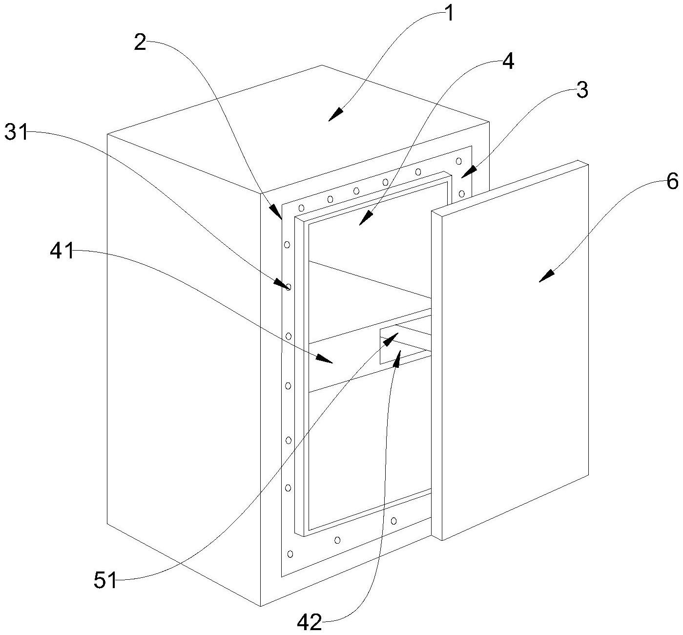 本实用新型适用于安防技术领域,提供了一种防盗保险柜,包括箱体,箱体的一侧面的中间设有开口,开口的侧面上设有固定槽、中间设有开口槽以及底部设有气缸,固定槽底部等距间隔设有机械锁孔,机械锁孔环绕开口槽设置,气缸的伸缩杆滑动连接有柜门,柜门的内侧面上连接有凸块,凸块卡接于开口槽内,柜门的内侧面还等距间隔设有与机械锁孔相适配的机械锁扣,机械锁扣环绕凸块设置,柜门与固定槽和开口槽配合连接,且柜门外侧边缘包覆于开口内,采用气缸作为动力源,能够自动开关门,并通过开设的机械锁孔和机械锁扣将箱体与柜门锁扣连接,并且将柜门包覆于箱体的开口内,柜门外侧面与开口的内侧面紧密贴合无缝隙,具有防撬和防切割的功能。