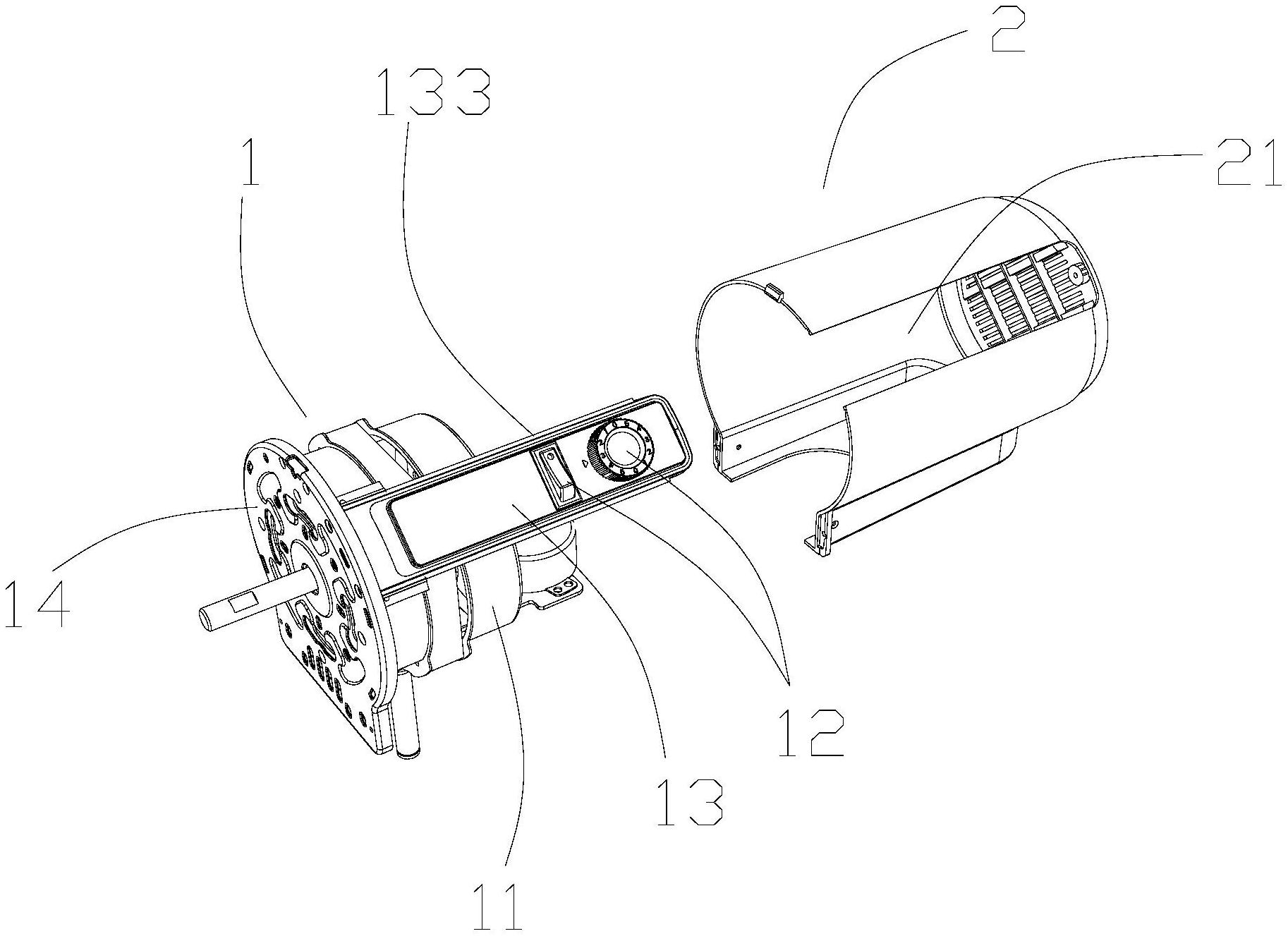 本实用新型提供了一种风扇机头的装配结构,包括电机组件和电机后罩,电机组件包括电机、控制安装板和电机前盖板;电机和所述控制安装板设置在电机前盖板的一侧;控制安装板朝与电机前盖板垂直方向延伸,电机和控制安装板电连接;电机后罩为开口罩体,电机后罩侧壁开设有安装槽,安装槽在电机后罩的轴向方向延伸,当电机后罩与电机组件连接时,控制安装板嵌合于安装槽中,控制安装板的外表面与电机后罩的外表面平滑连接。本申请中风扇机头的装配结构采用拼合的方式,所述安装槽与所述控制安装板形成扣合结构,采用拼合的方式组装风扇机头,使得组装更加方便牢固、高效准确。