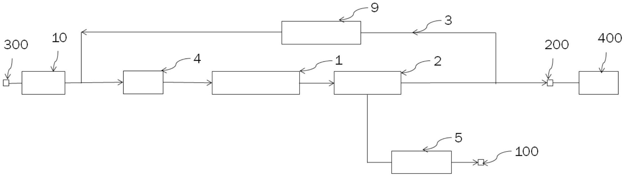 本实用新型公开了一种净水系统,其涉及水处理技术领域,净水系统包括:能够储水的容纳单元;第一过滤单元,所述第一过滤单元与容纳单元的容纳空间相连通;回水管路,回水管路的两端分别能与第一过滤单元的过滤水出口下游、容纳单元的进口上游相连通,回水管路、容纳单元和第一过滤单元能形成循环水路;设置在循环水路上的增压装置;净水系统具有第一状态,在第一状态下,增压装置处于开启状态,第一过滤单元的废水出口处于断开状态,以使流入第一过滤单元的水全部从第一过滤单元的过滤水出口排出形成过滤水,并通过回水管路回流至容纳单元。本申请在实现过滤水冲洗第一过滤单元的前提下能够有效简化净水系统的管路结构。