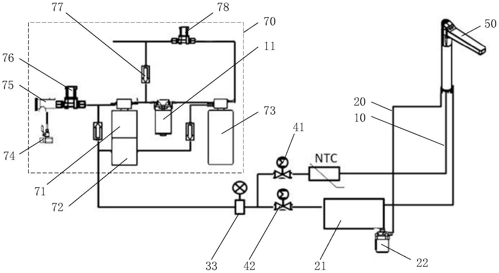 本实用新型提供了一种饮水系统,该饮水系统包括:出水端、冷水管路和热水管路,所述冷水管路与所述出水端连接,所述热水管路与所述出水端连接;所述冷水管路连接有第一水泵,所述第一水泵能调节所述冷水管路中冷水的流量。通过本实用新型,实现对混合后的温水的温度实现比较准确的控制。