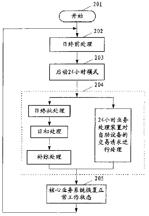 本发明公开了一种实现不间断服务的数据处理方法,包括如下步骤:执行日终前处理;进行24小时模式处理;恢复正常工作状态。所述进行24小时模式处理的步骤包括:由所述核心业务系统进行银行的日终批处理,同时由所述24小时业务处理装置处理来自从属或自助服务设备的交易请求;由24小时业务处理装置进行补账处理。本发明利用两个数据库,采用了数据库锁等待处理技术,利用表级锁处理技术,采用游标循环解决核心数据和第三方数据一致性的技术手段,可以实现全天候服务,实现每天24小时不间断对外服务的技术效果。
