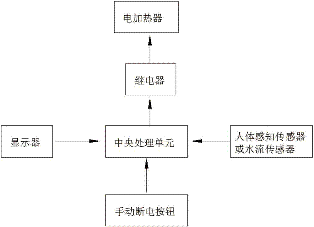 本实用新型是一种电加热热水器,包括水箱,在水箱上设有电加热控制仪,所述电加热控制仪设有壳体,壳体内设有中央处理单元和继电器,继电器通过控制线与中央处理单元的输出端相连;在水箱上装有电加热器,电加热器通过电源线与继电器相接;在水箱上还装有断电信号发射传感器,断电信号发射传感器通过信号线与中央处理单元的输入端相接。本实用新型通过在合适位置安装断电信号发射传感器,有人沐浴时,传感器将信号发送给中央处理单元,中央处理单元通过继电器控制电加热器电源的自动通断,从而实现安全沐浴,杜绝了电热水器漏电带来的隐患。