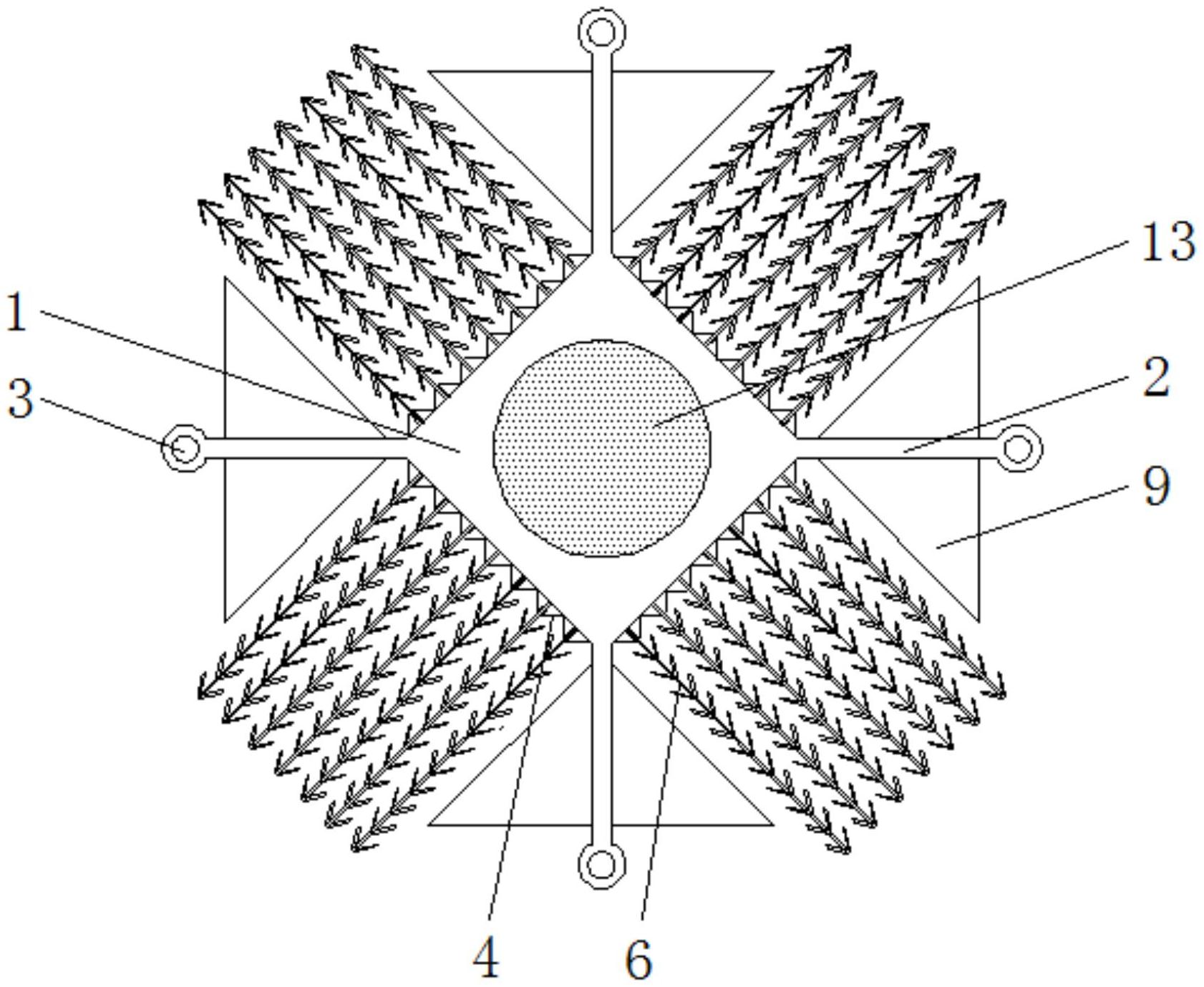 本实用新型公开一种PVC石墨烯材料导热体,属于导热体技术领域,包括安装座,所述安装座的四角处皆固定有固定板,所述固定板远离安装座的一端皆开设有安装孔,所述安装座的侧壁上均匀固定有锥块,且锥块上皆开设有十字形槽,所述安装座外侧的同一平面上均匀设置有第一导热片,所述第一导热片皆插接在十字形槽的内部。本实用新型安装座外侧锥块的设置,利用锥块内部的十字形槽对第一导热片进行限位,使得第一导热片与安装座之间能够拆分,采用拼接的方式进行安装,同时,利用十字形槽能够在拼接的过程中改变第一导热片的安装角度,便于不同位置使用。