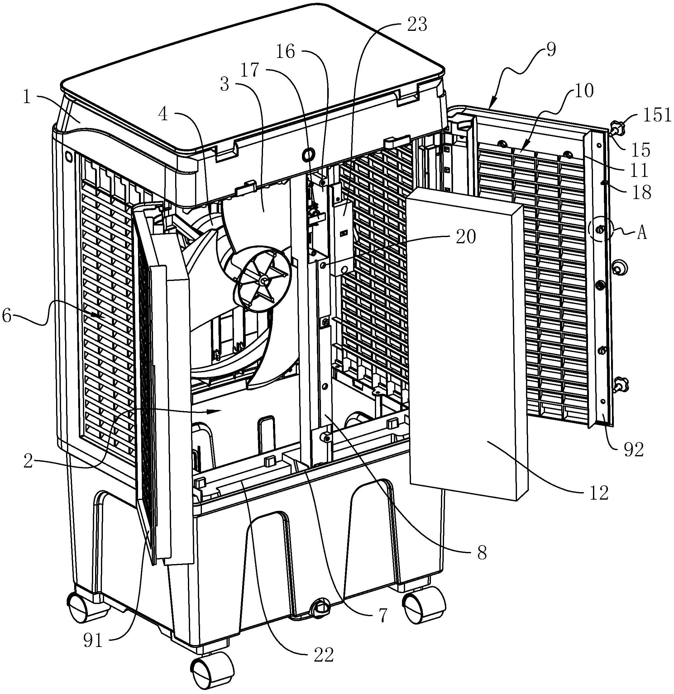 本申请公开了一种冷风扇,涉及风扇技术领域,其包括机壳,机壳内设有容纳腔,机壳转动连接有风叶,风叶位于容纳腔内;机壳设有出风口和进风口,出风口和进风口均与容纳腔连通;机壳开设有供清洁风叶时清洁工具通过的开口,机壳铰接有盖合开口的盖合板,盖合板穿设有与机壳螺纹连接的锁定螺栓,锁定螺栓用于在盖合板盖合于开口时将盖合板固定。通过设置开口、盖合板以及锁定螺栓,使得风叶的清洁操作更加方便。