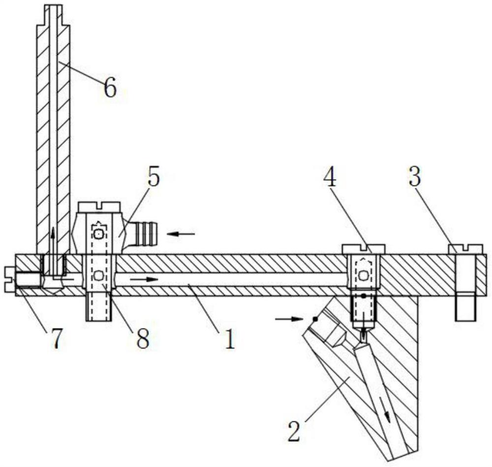 本实用新型公开了一种用于缝纫机针杆的回油装置,属于缝纫机技术领域。回油装置包括油配分器一、油配分器二、继手螺丝一、油管连接头、喷油管件、封堵螺丝、继手螺丝二和油泵,油配分器一的端部开设有回油腔,封堵螺丝装填在回油腔端部,喷油管件安装在油配分器一上,油配分器二通过继手螺丝一安装在油配分器一上,油配分器二呈文丘里结构,油配分器二与缝纫机针杆下套环之间连接有软管,继手螺丝一用于连通油配分器二和回油腔,油泵的输出端与回油腔连接。本实用新型依靠供油路径的回流润滑油经过油配分器二产生吸附力,以简单结构为针杆回油提供动力,降低了油泵的设计负担,优化了缝纫机针杆位置的回油设计,有效解决针杆渗油问题。