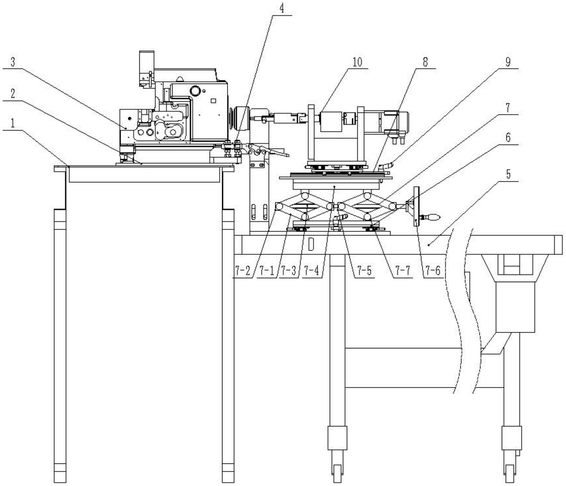 本实用新型涉及一种缝纫机扭力测量装置,属于缝纫机技术领域,缝纫机固定台上设置有滑道,底座下端面设置有滑块,滑块与滑道配合,底座上安装有缝纫机本体,缝纫机固定台一侧设置有扭力装置固定台,扭力装置固定台上安装有第一移动机构,第一移动机构上设置有升降机构,升降机构上设置有第二移动机构,第二移动机构与第一移动机构上均设置有锁紧机构,第二移动机构上安装有用于测量缝纫机本体手轮输入端的扭力的扭力测量机构,扭力装置固定台上设置有用于定位底座的压紧器。本实用新型提高了测量扭力的效率,同时减少了人工测量造成的误差,同时可以将数据集中处理。