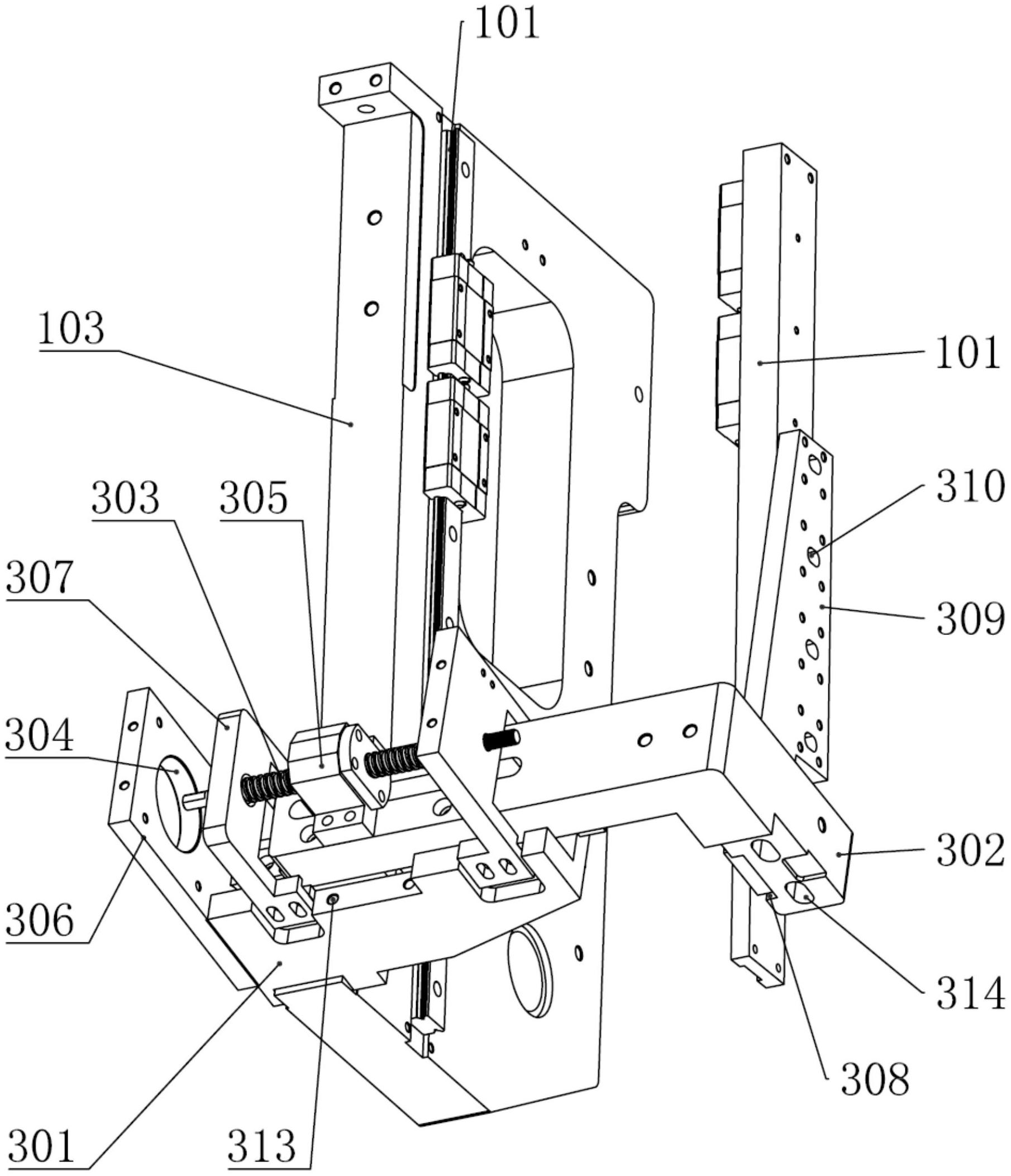 本实用新型属于自动裤襻机技术领域,具体涉及一种自动裤襻机的调节装置以及自动裤襻机,自动裤襻机的调节装置位于自动裤襻机的上端,用于调节卷料送料装置中两侧导轨之间的距离,进而调节两侧导轨上送料臂之间的距离,最终调整设备缝纫裤襻带的长度,包括固定支架,固定支架上固定设置有自动裤襻机的一侧导轨;调整支架,调整支架移动设置在固定支架上,调整支架用于连接自动裤襻机的另一侧导轨,并且调整支架与导轨同步移动;传动件,传动件设置在调整支架上;传动件用于带动调整支架移动,从而移动一侧的导轨,进而调整两侧导轨之间的距离,进而实现自动裤襻机的调节装置调节送料臂之间距离的自动化,提高了设备的安全性以及工作效率。