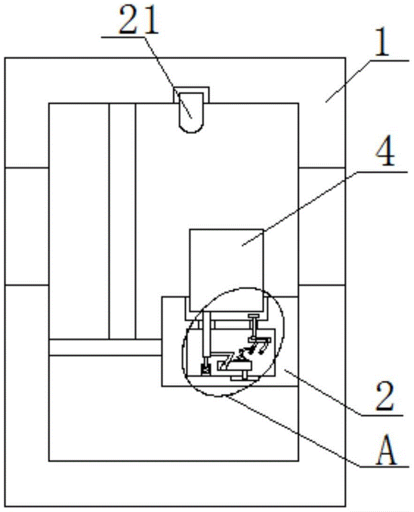 本实用新型属于空气净化器领域,尤其是一种厨房用杀菌空气净化器,针对现有的空气净化器在使用时,会由于风机运作产生较大的震动,较大的震动会产生较大的噪音,使用人员长期听到会很烦躁,严重影响使用人员心情的问题,现提出如下方案,其包括空气净化器,所述空气净化器的一侧设有安装座,安装座的顶侧开设有安装槽,安装槽内设有风机,所述安装座上开设有放置腔,放置腔的顶侧内壁上开设有压杆孔和顶杆孔,本实用新型结构简单,风机运作产生震动带动压杆移动压杆移动从而带动L型转杆转动,L型转杆转动从而带动顶杆阻止风机产生的震动,使风机运作产生的震动能够达到大幅度的减缓,有效降低了噪音的产生,使用方便。
