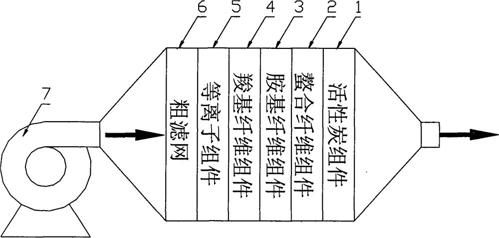 本发明公开了一种用于烟味祛除的装置及其方法,该装置分别使用粗滤网及低温等离子体组件、羧基纤维组件、胺基纤维组件、金属离子螯合纤维组件、活性炭组件,分别将香烟烟雾中的固体颗粒物及碱性气体、醛类等酸性气体、CO气体及其他有害气体成分。测试表明,该烟味祛除装置可以快速、高效祛除香烟烟雾中的颗粒物、CO、醛类及挥发性胺类物质;并且,装置功率低,噪音小。