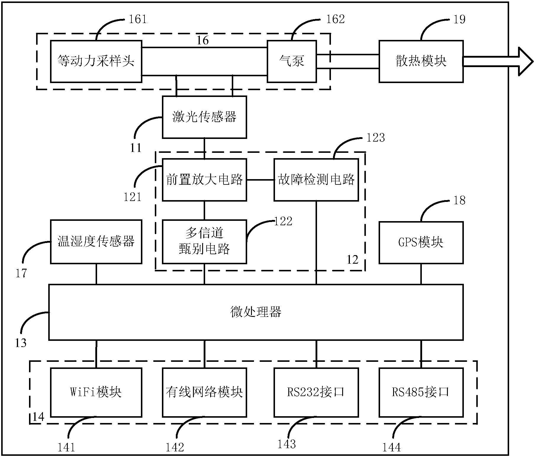 本实用新型实施例公开了一种检测终端及空气质量检测系统。该检测终端包括激光传感器、检测电路、微处理器、通信模块以及空气采样装置;所述空气采样装置用于产生预定流量的采样气流;所述激光传感器用于检测所述气流内的悬浮颗粒物,形成对应的光信号;所述检测电路用于将所述光信号转换为电信号并输出至所述微处理器中;所述通信模块与所述微处理器连接,用于输出数据和接收指令。检测终端具有良好的使用性能,能够满足用户的需求。监控平台与监控终端之间数据交互充分,可以通过监控平台将悬浮颗粒物的数量以及浓度等清晰的表示出来,具有良好的应用效果。