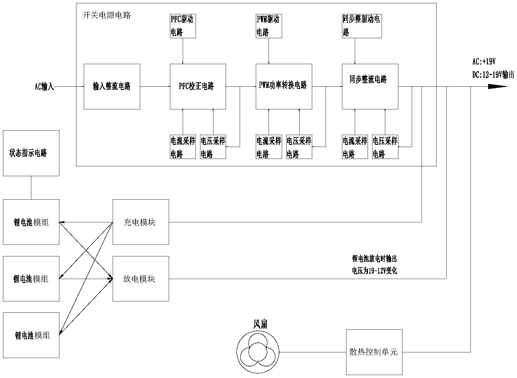 本实用新型涉及电脑供电技术领域,尤其是指一种具有不间断供电功能的一体机电脑供电装置,若是交流电供电,则通过开关电源电路将电压转换成一体机电脑所需的工作电压,同时开关电源电路通过充电模块为若干锂电池模组充电,当开关电源电路没有输出时,则转为锂电池模组供电,锂电池模组通过放电模块供电,使一体机电脑在无交流电供电时依旧可以使用;另外,在各个锂电池模组充电后或者锂电池模组放电时,控制器通过充放电平衡模块,使具有较高电压的锂电池模组向电压较低的锂电池模组放电,使得若干的锂电池模组的电压均趋于平衡,从而使所有的锂电池模组在使用时具有较高的一致性,避免损坏低电压的锂电池模组。