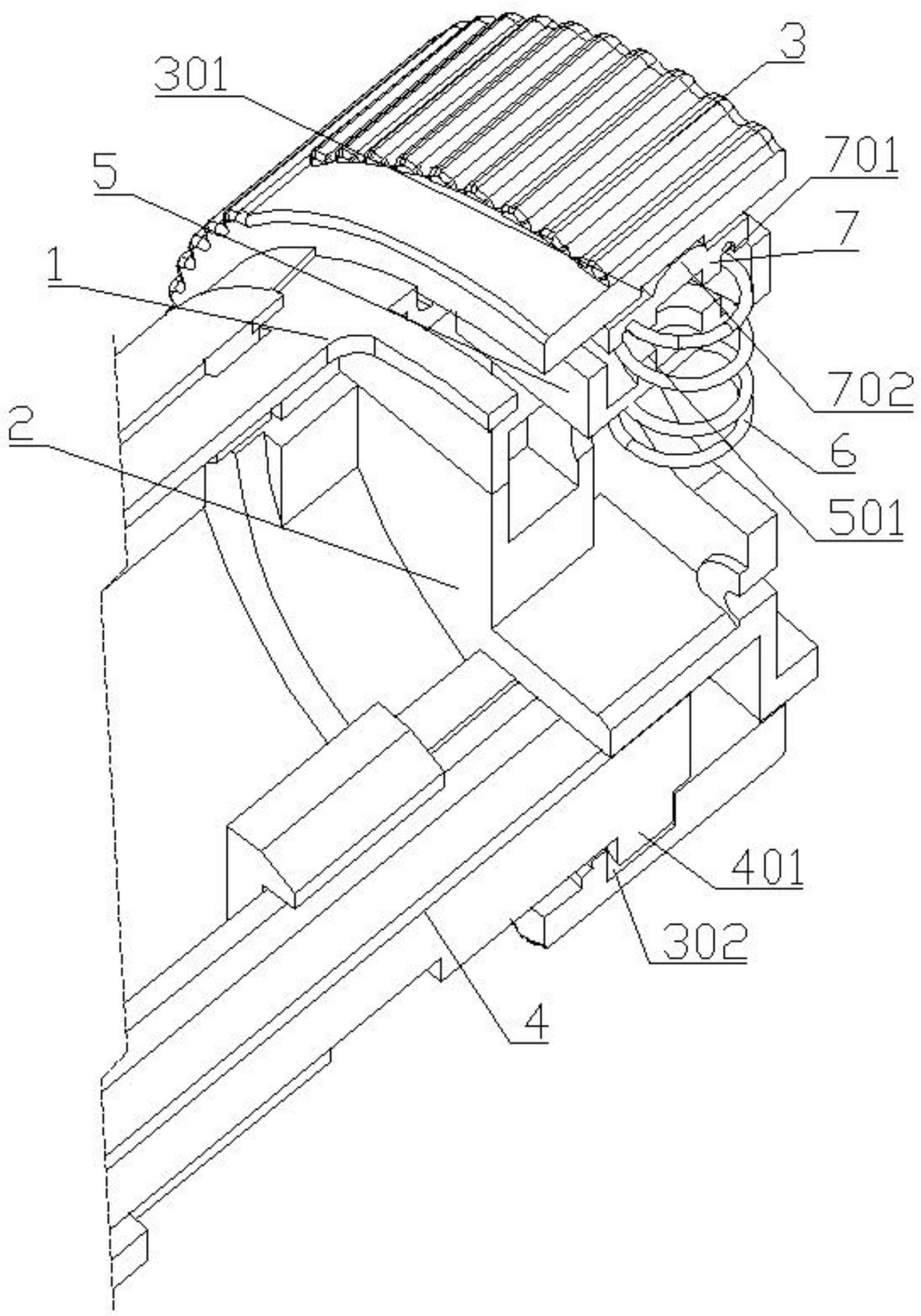 本实用新型公开了一种机尾旋钮刀头调节结构,包括上内主体和下内主体,所述上内主体和所述下内主体组合在一起,所述下内主体下端设有主体凹槽,所述主体凹槽内设有推杆,所述上内主体和所述下内主体外套设有调节旋钮,所述调节旋钮下端内侧面设有内嵌槽,所述调节旋钮上端相对所述内嵌槽的位置设有滑槽,所述滑槽下端设有定位板,所述定位板下端设有弹簧座,所述弹簧座上卡设有所述弹簧;本实用新型刀头调节方便。
