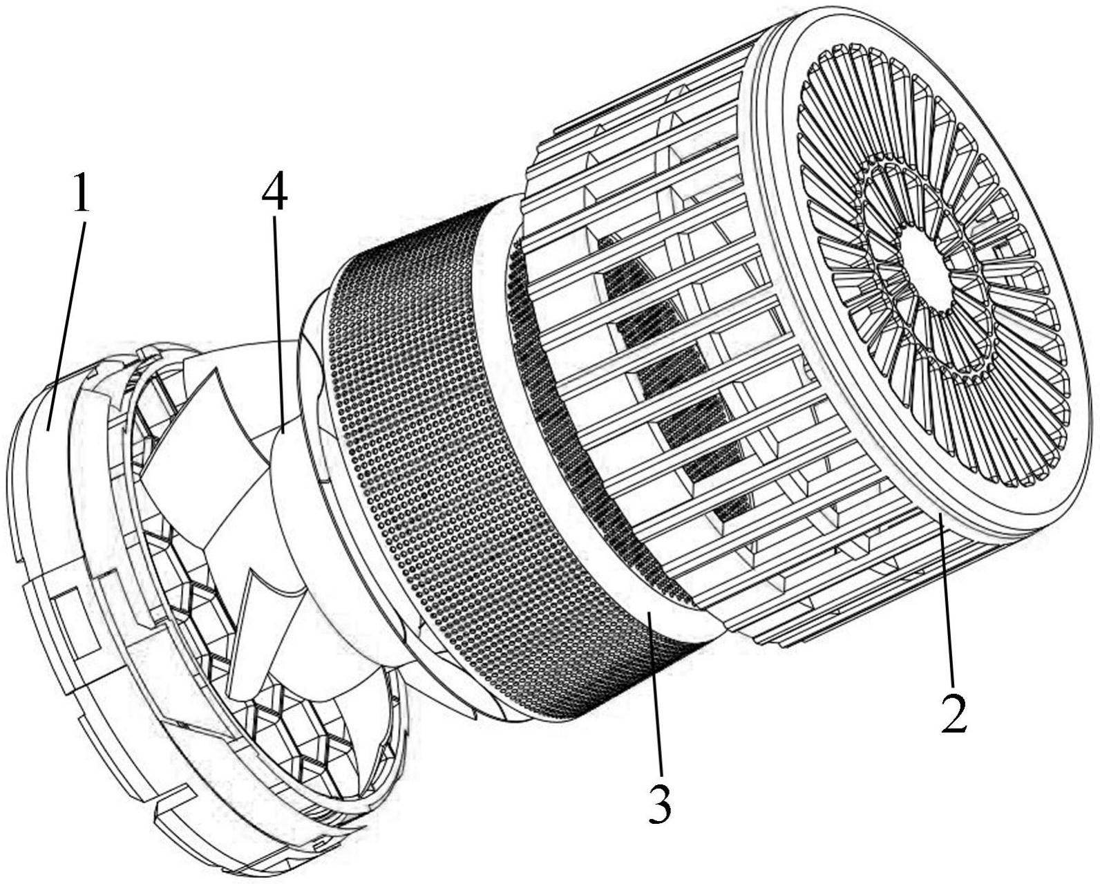 本实用新型涉及电吹风结构技术领域,尤其涉及一种电吹风的进风口结构及电吹风。本实用新型采用如下技术方案:一种电吹风的进风口结构,包括进风板、进风外罩和进风内罩,进风内罩嵌套在进风外罩内,进风外罩可拆卸连接在进风板上,进风板固定设置于电吹风的进风口处,所述进风内罩和进风外罩整体为圆柱状,且进风内罩和进风外罩的罩体和罩顶均设置有进风孔。本实用新型的优点在于:通过使用圆柱状的进风外罩和进风内罩并在其罩体和罩顶上均设置进风孔,从而增加进风孔的面积,可大大增大进风结构的进风量,同时配合进风内罩内的导风道,可以使气流更集中地进入电吹风中,且进风外罩和进风内罩可拆卸,方便对其进行清理。