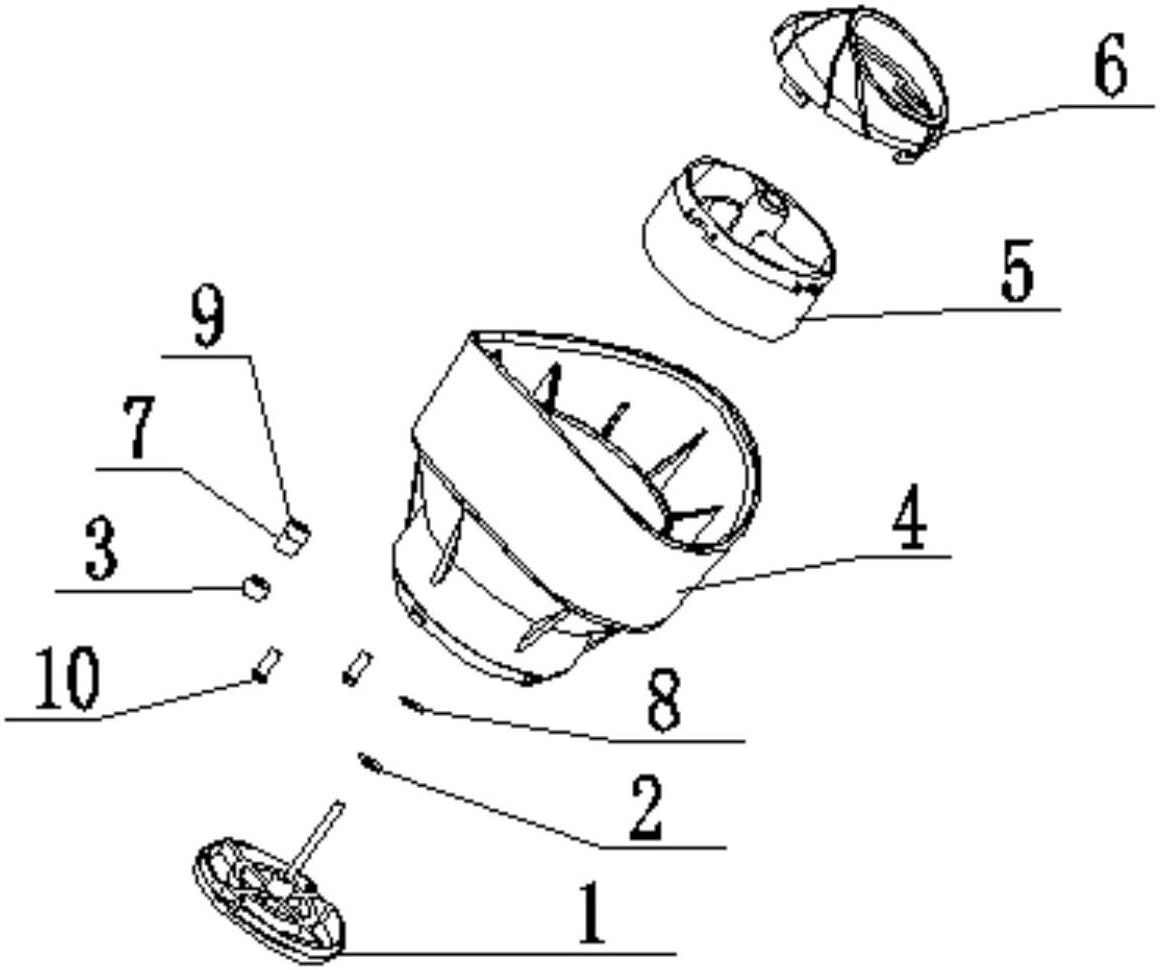 本实用新型公开了电吹风风嘴,包括底座连接、垫片、下铜套连接、主体连接、上配件连接、上盖连接、上铜套连接、垫片连接、固定铜套连接和固定螺丝;本实用新型的有益效果是:该风嘴结构连接紧凑,使用简单,该电吹风风嘴采用球状铜套连接,可减少摩擦力,导风嘴运行更顺畅,上盖连接活动嵌套在上配件内组成导风嘴,且导风嘴采用360度无死角方式出风,使用方便,上配件连接可通过底座连接上的旋转轴在主体连接内转动,便于360度全方位出风,且旋转轴含注塑料件,可提高上配件连接的坚固性,同心度好,底座连接上设置有卡扣型凸起,可稳定牢固的将风嘴安装在电吹风上,使用时稳定性强,适合推广使用。
