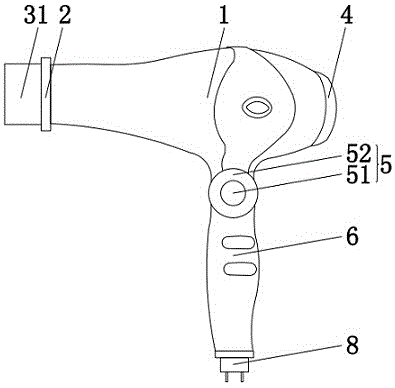 本实用新型提供一种耐用大功率电吹风。所述耐用大功率电吹风,包括机体;固定套,所述固定套滑动连接于所述机体的一侧;防尘组件,所述防尘组件固定连接与所述固定套的一侧;散热网,所述散热网固定连接于所述机体的另一侧;折叠组件,所述折叠组件固定连接于所述机体的底部;机柄,所述机柄固定连接于所述折叠组件的表面;插头,所述插头设置于所述机柄的底部;收纳组件,所述收纳组件固定连接于所述插头的顶部。本实用新型提供的耐用大功率电吹风具有可轻松拆卸的防尘组件,便于清理,且折叠组件用于对电吹风进行折叠,减少占用空间便于携带,收纳组件对连接线进行收纳,防止其损坏。
