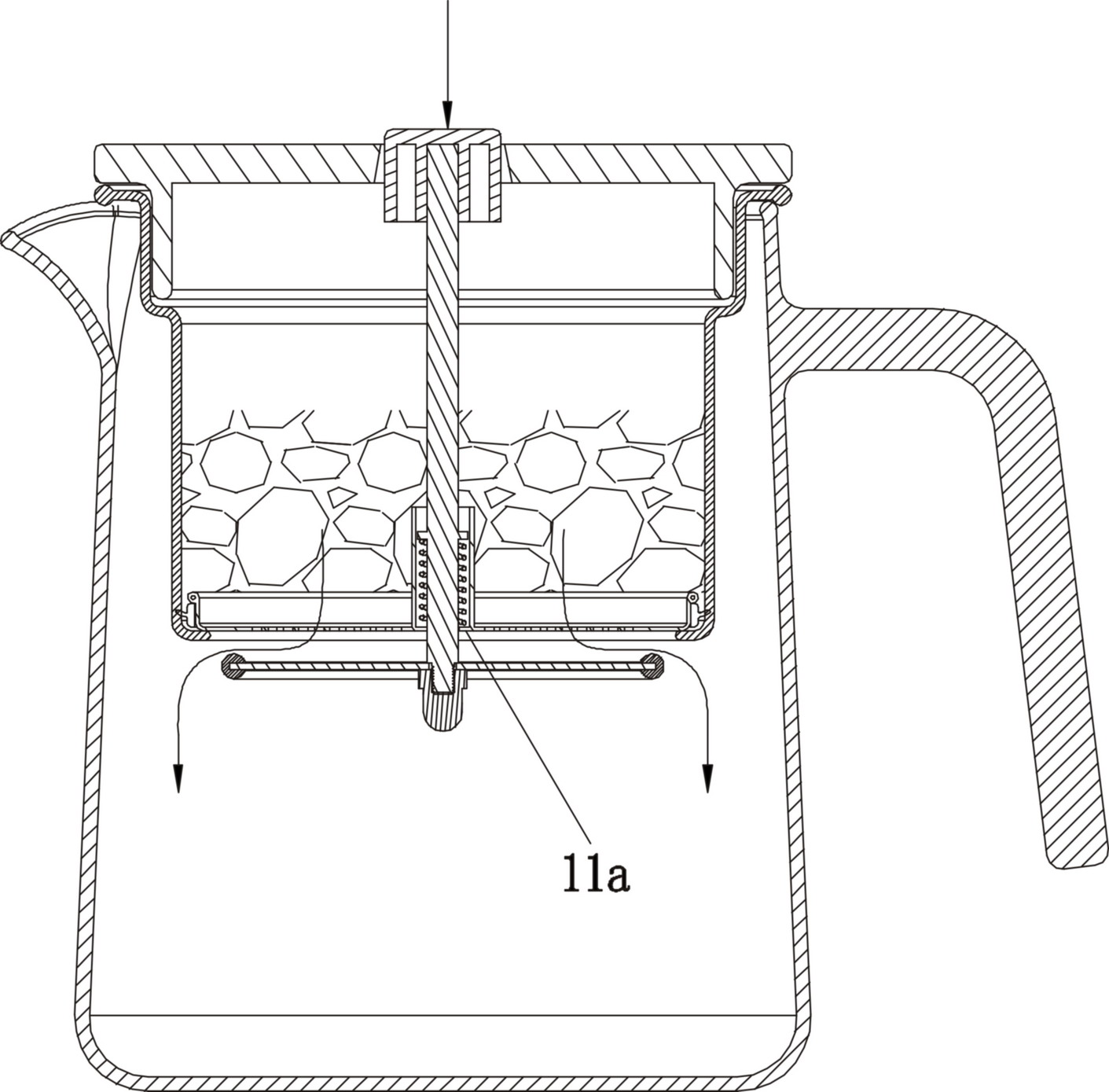 本实用新型公开一种过滤机构及其过滤杯和泡茶壶,涉及过滤结构出水的改进和可拆卸的装配,它包括滤网、压杆和弹簧,压杆下部有挡环,滤网中间有套筒,特点是,还包括封堵板,封堵板上方设有封堵板硅胶圈,封堵板连同封堵板硅胶圈位于滤网下方,使封堵板遮挡滤网筛孔,由封堵板硅胶圈密封封堵板与滤网之间缝隙,防止液体从该缝隙逐渐泄出,弹簧套于压杆下部且弹簧顶端抵在挡环处,压杆下部连同弹簧安装在套筒中,弹簧末端抵在套筒底部挡圈处,压杆下端部从套筒中穿出且与封堵板构成可拆卸固定,并使弹簧受到压缩,压杆在外力作用下可带动封堵板离开滤网,从而打开出水口,让液体向下流出,机构可在过滤杯和泡茶壶中使用,并带来安全性等优点。