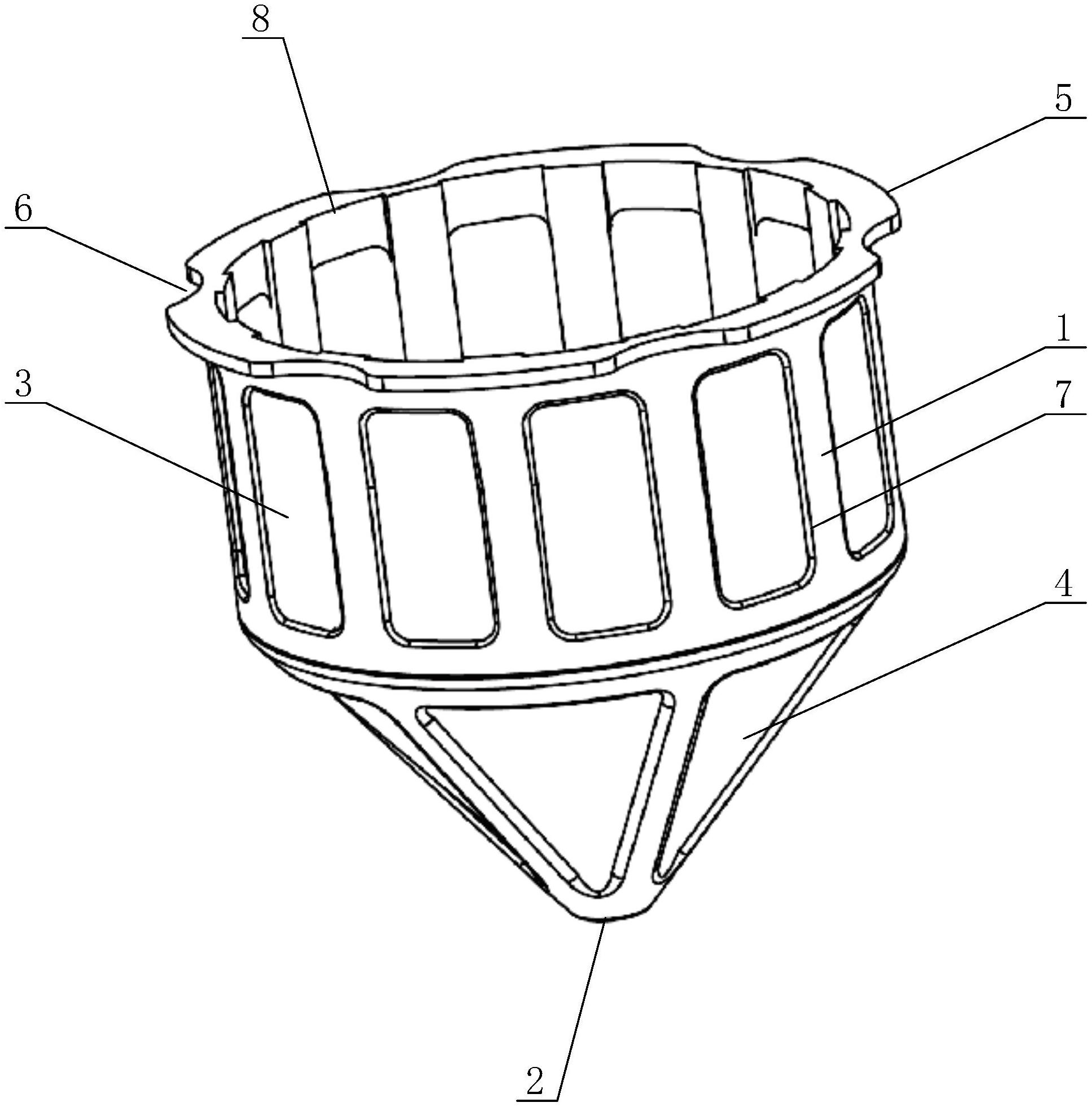 本实用新型公开了一种咖啡冲煮设备的滤杯,主要涉及咖啡冲煮设备领域;包括筒状主杯体,所述筒状主杯体的底部设有底杯体,所述底杯体的横截面的面积自上而下逐渐减小,所述筒状主杯体的外壁上设有若干个第一滤网,所述底杯体的外壁上设有若干个第二滤网,底杯体与筒状主杯体可拆卸连接;本实用新型可同时满足小直径、大容量的需求,增大了咖啡液下液面积,能够确保咖啡萃取充分、均匀,提高了萃取效率,可重复使用,方便冲洗。