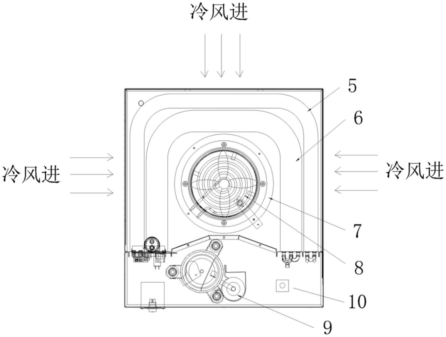 本实用新型涉及一种离心式花椒烘干机。随着热泵烘干技术的快带推进,目前的花椒烘干机大多采用单一的热空气直排加热的简易模式,其排风风机大多是离心风机,未考虑到低温环境下系统结霜,噪音大,控制人性化,成本低等问题。本实用新型包括壳体,壳体内设置压缩机、冷凝器和蒸发器和螺旋电加热器,所述的蒸发器连接冷凝器,冷凝器连接螺旋电加热器,所述的螺旋电加热器连接轴流风机,所述的轴流风机出口对接烘干桶的进风口。本实用新型噪音低,风流速慢,除湿效果更好,提高烘干效率,节省能耗。