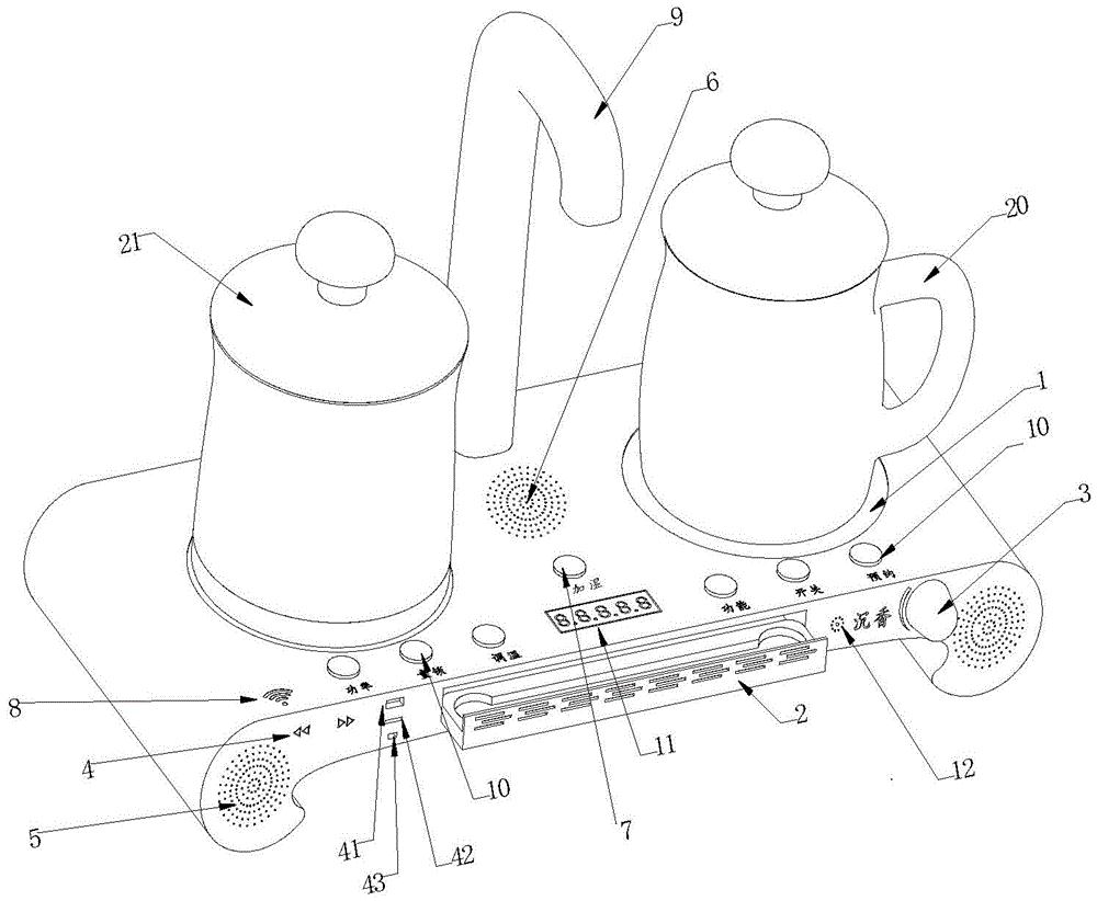 本实用新型涉及一种修心智能电子泡茶具,包括底座和壶体,所述底座设有加热盘和沉香容纳槽;所述沉香容纳槽的底部设有用于对沉香进行加热的沉香加热组件;所述底座上还设有调温开关,所述调温开关与所述沉香加热组件连接。本实用新型提供的修心智能电子泡茶具,在现有底座的基础上增设了沉香容纳槽,用于放置沉香,并可对沉香容纳槽内的沉香进行可控温度的加热,在品茶时,打开沉香香薰,大大提高了用户品茶的乐趣和体验。