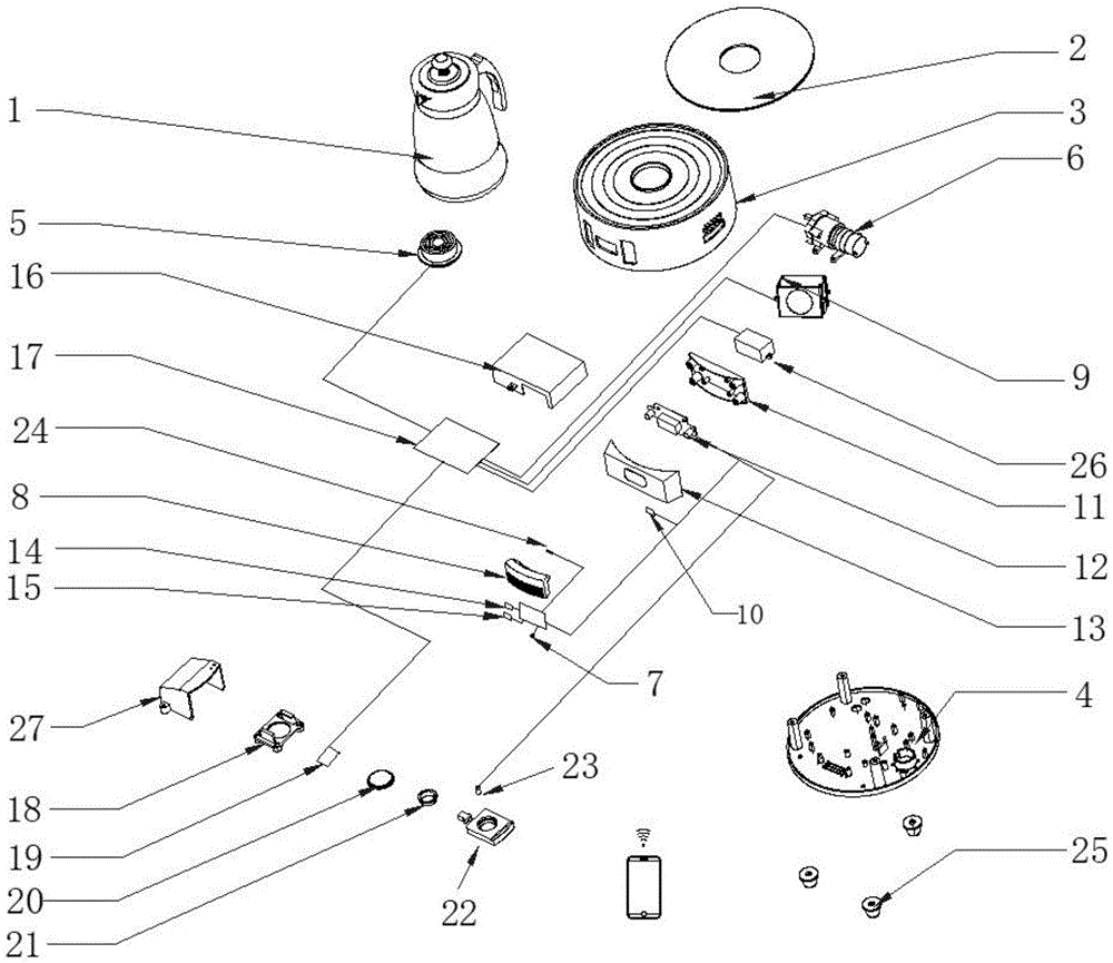 本实用新型涉及智能家居技术领域,具体为一种用于家具控制的多功能智能煮茶装置,包括电热水壶和底座,所述底座包括面板、上壳、底壳和耦合器,所述上壳固定安装在底壳上,上壳的上方安装有面板,所述面板用于所述电热水壶的放置。可以通过互联网查找后直接显示,也可以通过机器自带的带显示控制器的显示屏播放视频.泡茶流程技巧,普及茶文化,让更多的人能够了解和喜欢茶文化,便于普及,且功能齐全,本产品具有语音识别系统,内置有语音控制模块,实现通过智能沏茶器对家里的家居及电器设备进行语音控制操作,可以通过语音直接说出你想要控制操作的家具及家电,开启或关闭工作状态,提高了用户的使用体验,具有很强的实用性。