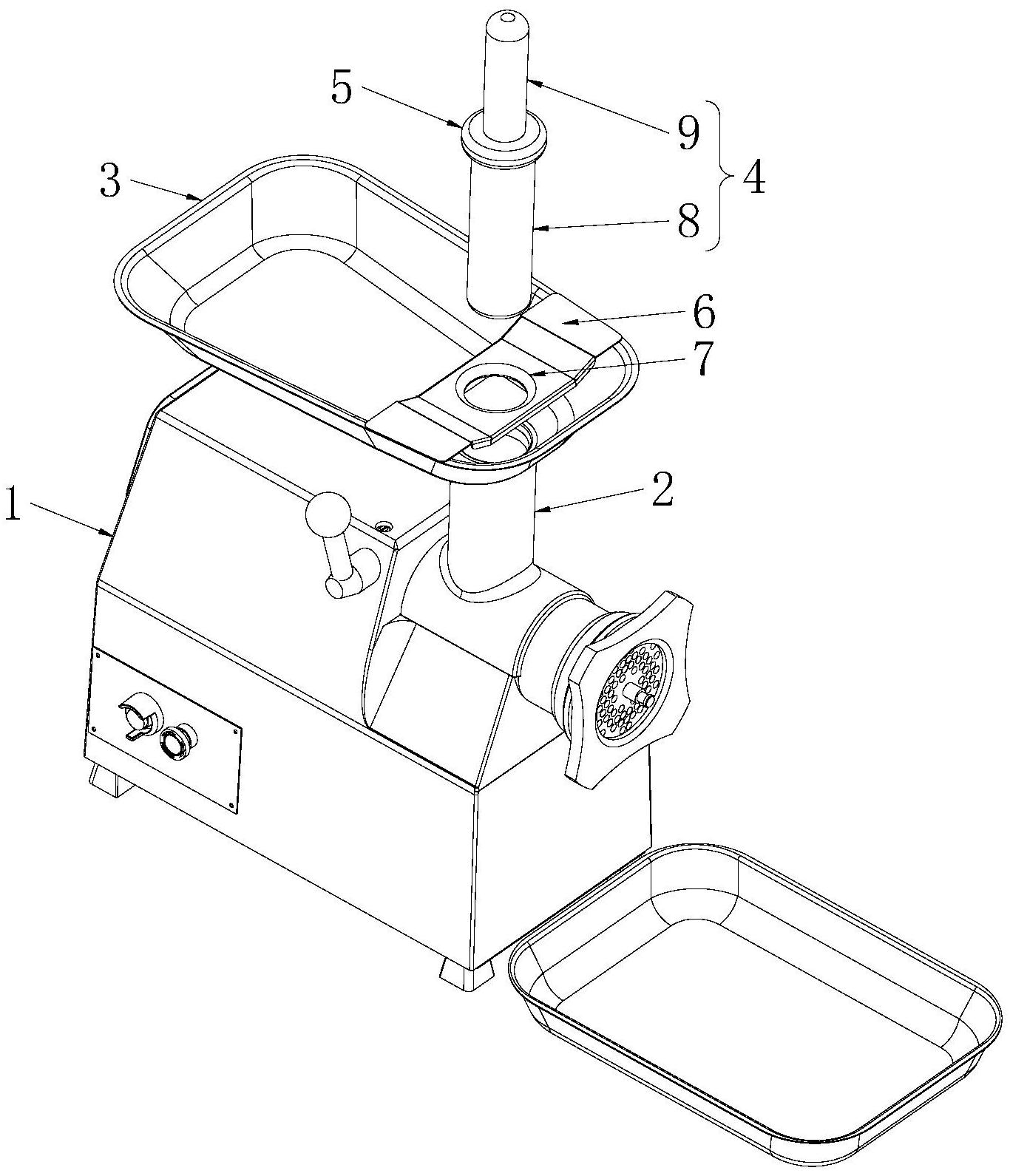 本实用新型公开了绞肉机,绞肉机包括机架、安装于所述机架的电机、安装于所述机架并与所述电机驱动连接的绞肉刀。所述机架设有导肉管,所述导肉管的顶部连接有盛肉盘,所述导肉管的底部接通至所述绞肉刀。所述绞肉机还包括压肉疏通棒,所述压肉疏通棒与所述导肉管适配,所述压肉疏通棒用于将堵塞在所述导肉管内的肉块压向所述绞肉刀。所述压肉疏通棒上连接有限位件,所述限位件位于所述导肉管的上方,所述限位件用于抵接所述盛肉盘以阻止所述压肉疏通棒向下运动。其能够使人安全地使用设备,以避免绞肉机对人身造成伤害的现象。