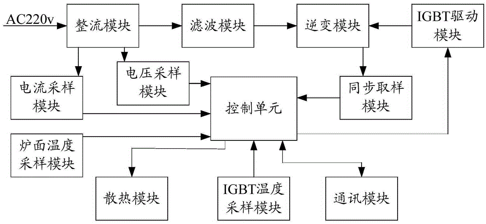 本实用新型涉及一种电磁炉电路,包括:整流模块、滤波模块、逆变模块、IGBT驱动模块、控制单元、同步取样模块、电压采样电路、电流采样电路、炉面温度采样模块以及IGBT温度采样模块。上述电磁炉电路,电路核心的控制单元具备高性能精简指令集,专门为需要A/D转换的产品而设计,将该控制单元应用与本实用新型的电路中,外围电路采用整流模块、滤波模块、逆变模块、IGBT驱动模块、同步取样模块、电压采样模块、电流采样模块、炉面温度采样模块以及IGBT温度采样模块。相比传统的电磁炉电路,省去了在外围电路搭建同步电路、积分电路以及功率调节电路等麻烦,简化了电路的结构,产品工作的可靠性也得到提高,也有利于降低生产成本。