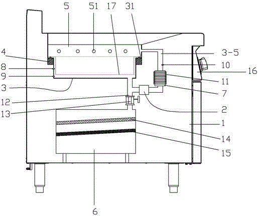 感应加热油炸炉,炸缸固定在柜体中,炸缸的内壁上成型有炸缸台阶,过滤缸上成型有升降杆插窝和振动磁芯插窝,壳体固定在柜体上,升降杆的上端插套在升降杆插窝中,升降复位弹簧插套在升降杆上,升降杆的上端作用力地过滤缸、下端作用力于升降降杆;振动套成型或固定在壳体上,振动复位弹簧和振动磁芯插套在振动套中,振动磁芯的上端插套在振动磁芯插窝中,电磁线圈置于振动套的外部且插套在振动套上;炸缸上安装有炸缸液位探头和炸缸温度探头,位于油加热室与出油管相通接的回油管道上安装有加热室温度探头。它油油温均匀,温差少,能提高油使用率。它能控制油温减小油温温幅,将油温恒定在设定值。