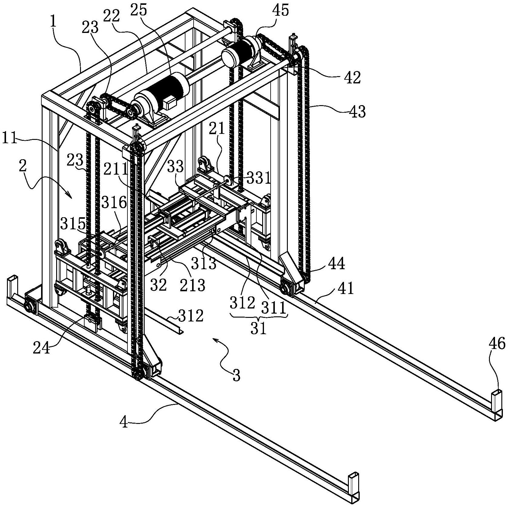本实用新型涉及升砖机构领域,特别涉及一种用于砌块生产线的升砖机,包括机架,还包括升降机构、夹持机构,升降机构包括升降架、第一电机,升降架可竖向移动的设于机架上,第一电机驱动升降架竖向移动,夹持机构包括夹持爪、夹持气缸、调位气缸,夹持爪设有两个,分别可横向滑动的设于升降架上,夹持气缸两端分别连接两夹持爪,通过夹持气缸带动两个夹持爪相互靠近或分离,调位气缸固定设于升降架上并设有两个,两个调位气缸相对升降架中部位置对称设置,调位气缸外侧一端设有拉板,拉板可拉动夹持爪朝向内侧移动,两个调位气缸同步动作,使两个拉板向内移动以将两夹持爪朝向升降架中部位置调整,防止发生偏移。