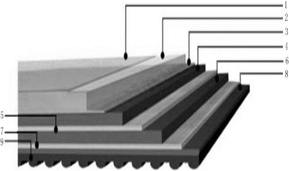 本实用新型涉及地板领域,具体涉及一种平衡结构可移动式环保地板。所述平衡结构可移动式环保地板包括自上而下设置的PUR涂层(1)、耐磨层(2)、印刷层(3)、第一PVC层(4)、第一玻璃纤维层(5)、第二PVC层(6)、第二玻璃纤维层(7)、第三PVC层(8)、防滑底层(9);所述各层结构通过高温热熔的方式热压融合在一起;所述第一玻璃纤维层(5)距耐磨层(2)的距离与第二玻璃纤维层(7)距防滑底层(9)的距离相等,均为1.4‑1.6mm,并且所述两层玻璃纤维层呈网状结构对称分布。所述平衡结构可移动式环保地板的厚度为5mm,具有免胶自沉吸附地面的特性,可实现无胶安装,减少污染,易于拆装可重复利用,达到节能环保的目的。
